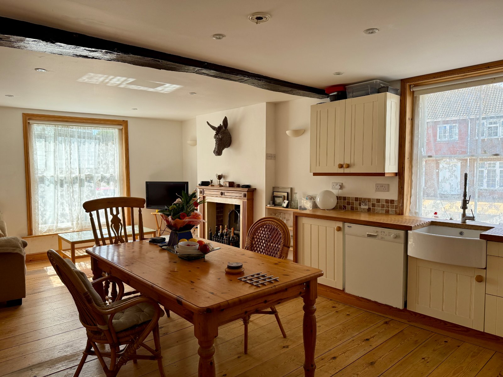 Steps lead up from Griffin Street to the front door and entrance hall off which is the kitchen/living/dining room and a cloakroom. The kitchen/living/dining room enjoys a slightly elevated position above street level, and being double aspect, benefits from light all day. The room is a generous size with an open fireplace in the seating area and ample space for entertaining guests.