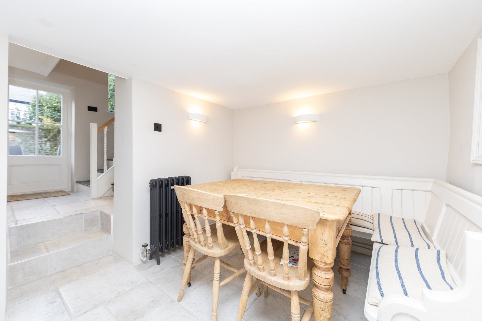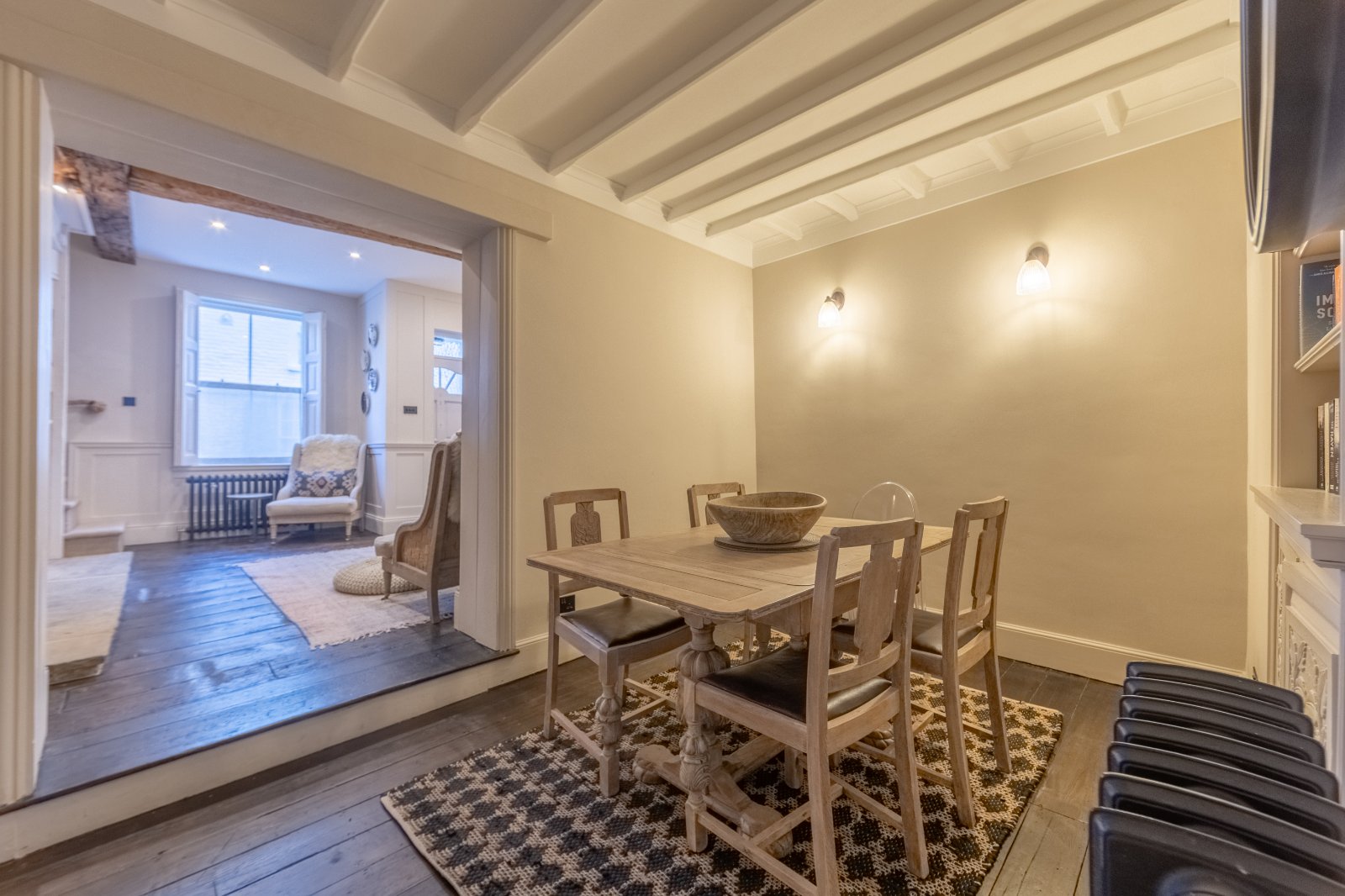 On the ground floor, a generous sitting room provides an inviting focal point, centred around an exposed brick chimney breast with wood-burning stove, while bespoke joinery and carefully considered lighting enhance the sense of craftsmanship. To the rear, a separate dining room offers a defined yet flexible space for entertaining, with a bathroom discreetly positioned nearby. The lower ground floor is dedicated to everyday living and informal entertaining, comprising a bespoke Shaker-style kitchen and an adjoining breakfast room. The kitchen opens directly onto the garden, a particularly appealing layout for properties within the Conservation Area.