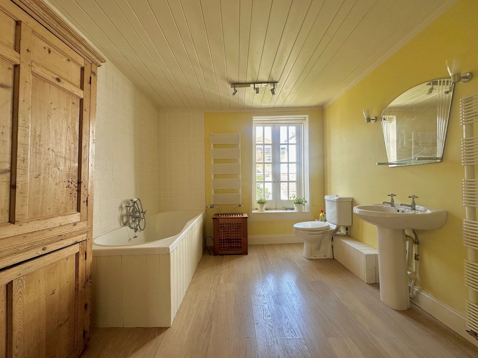 and wall mounted gas fired boiler. A door leads out to the rear yard. A trap hatch in the kitchen gives access to steps down to the basement room with mirror fronted storage cupboards and attractively exposed brickwork and beams.