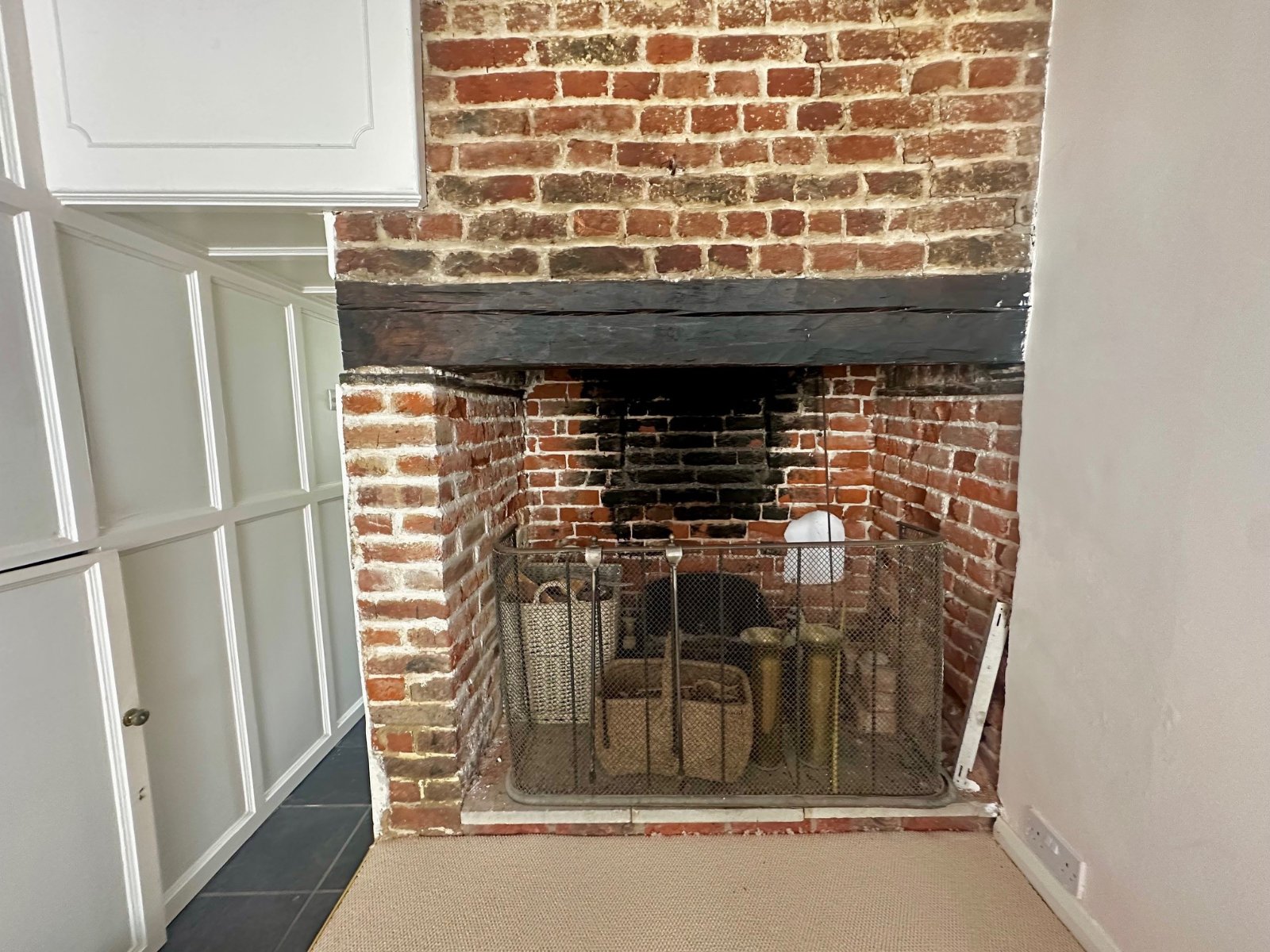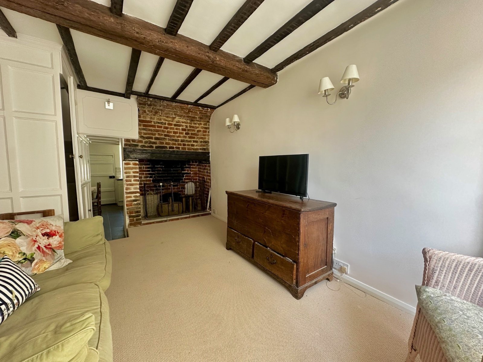 The welcoming sitting room features an attractive open brick fireplace with bressummer beam and exposed chimney breast, together with a built-in storage.