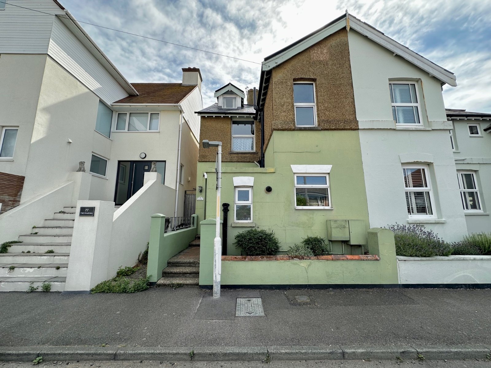 The internal accommodation is arranged over three floors and includes three reception rooms, one of which is a first floor sitting room that opens onto a sun room and an enclosed balcony with views across the Channel. A kitchen and useful downstairs WC complete the ground floor accommodation.