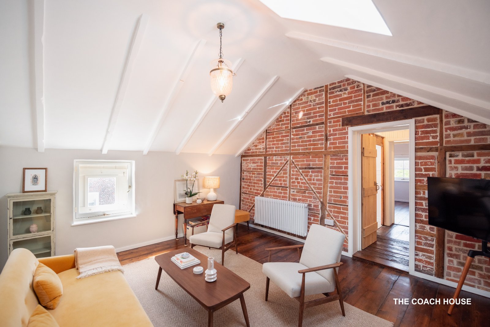 The ground floor centres around a charming kitchen/dining room, fitted with a bespoke solid wood kitchen with quartz worktops and original brick flooring and fireplace. It enjoys attractive views across the garden of the main house, creating a welcoming space for cooking and dining.