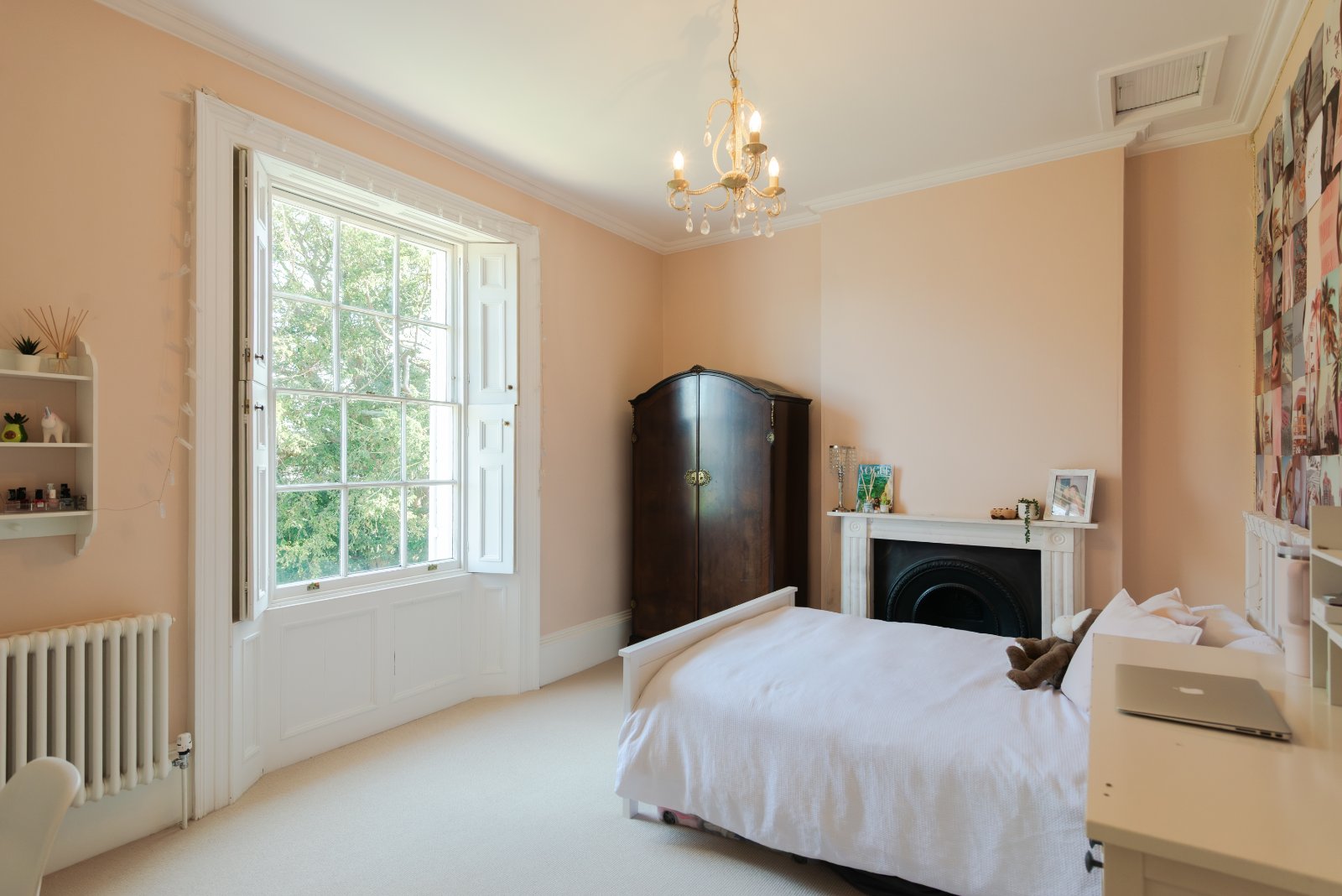 Off the first floor landing is the principal bedroom, an impressive room enjoying two deep sash windows overlooking the gardens, and an attractive fireplace with marble surround. A communicating door leads to a cloakroom en-suite fitted with a WC and pedestal basin.