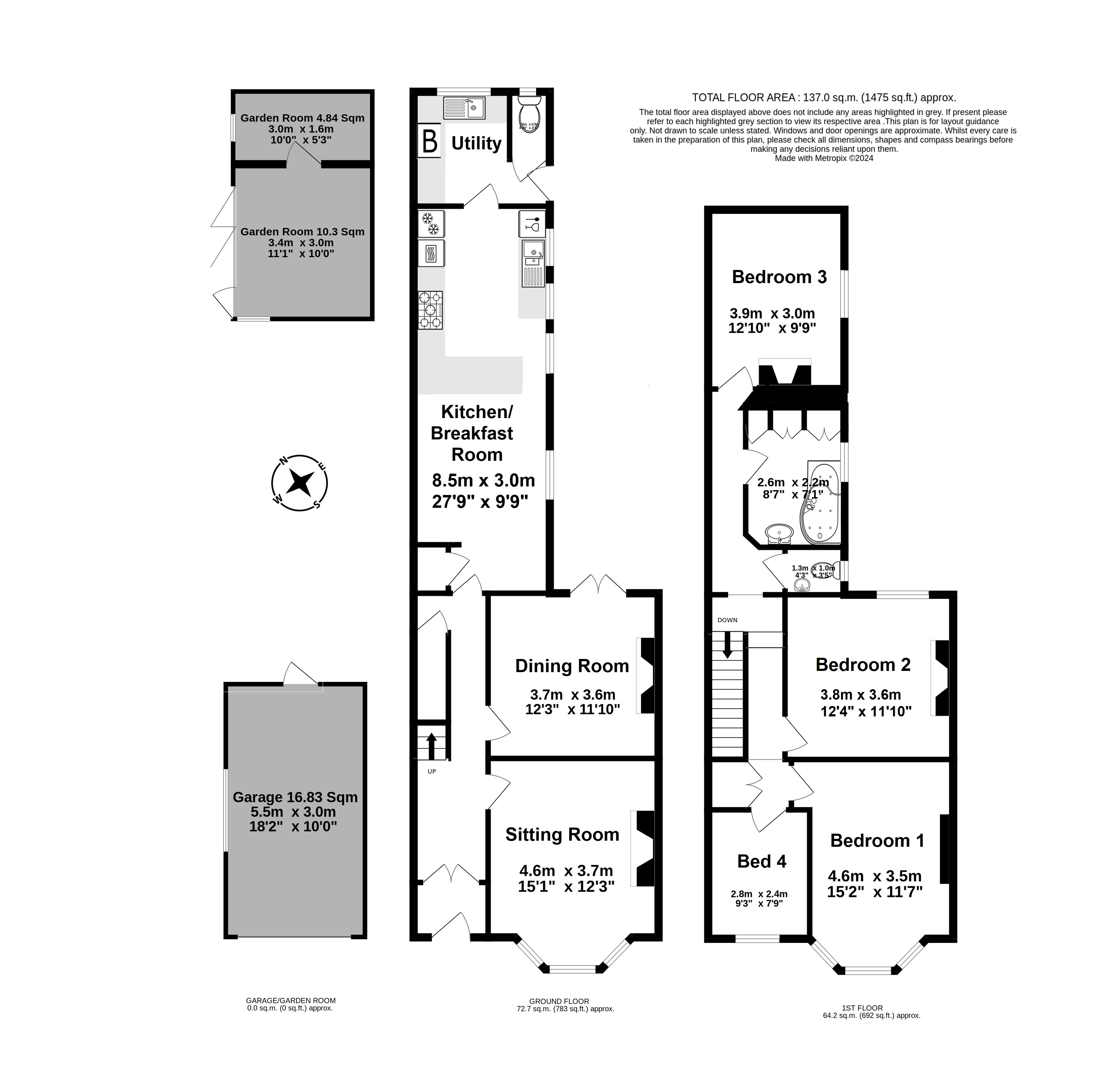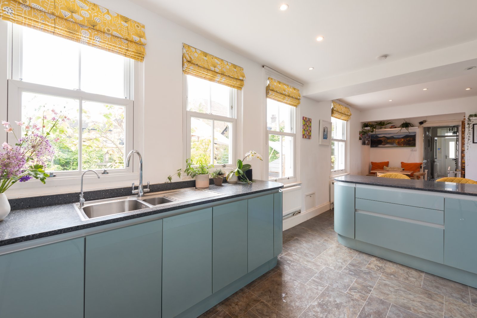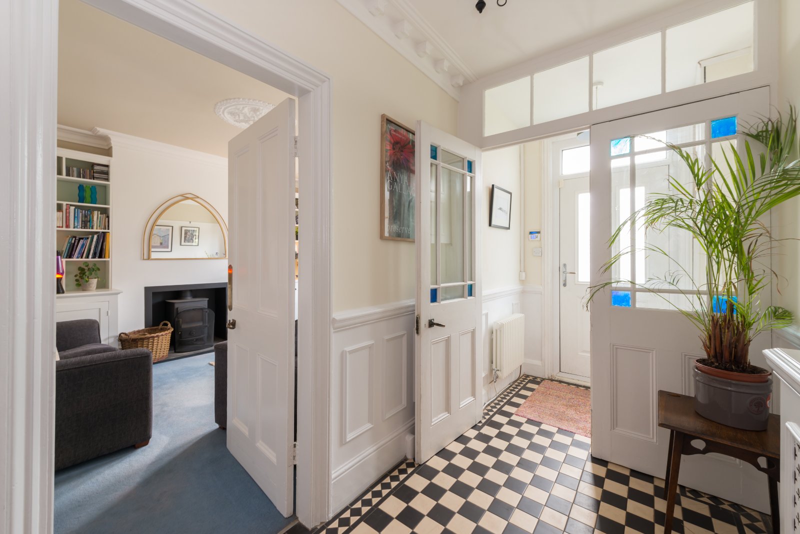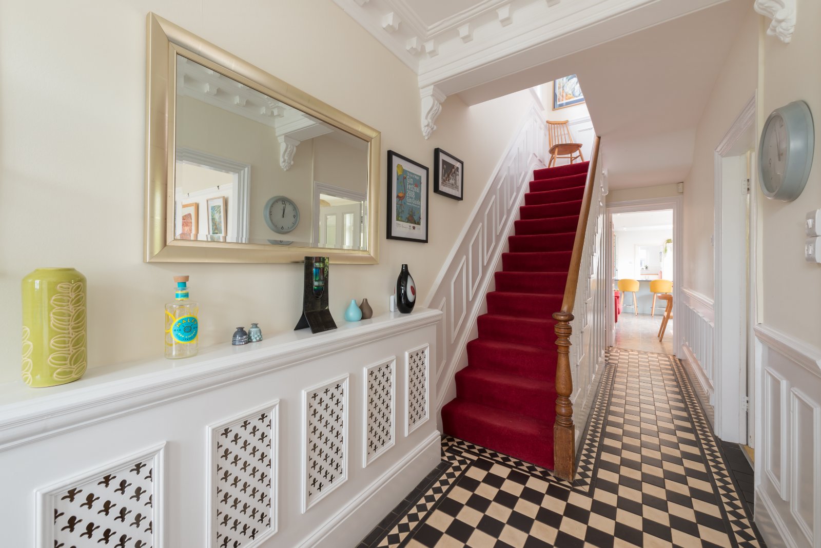 You are greeted with a classic black and white chequered floor in the reception hall. The front sitting room enjoys a traditional bay window, while the rear dining room opens through French doors to the back garden. At the heart of the home is a bright and airy kitchen/breakfast room, flooded with natural light from large sash windows overlooking the rear garden. The space is fitted with modern units and integrated appliances, including a gas hob, extractor, oven, built-in fridge and freezer. Beyond the kitchen is a separate utility room with an additional sink and plumbing for laundry appliances, plus access to a ground floor cloakroom and the garden.