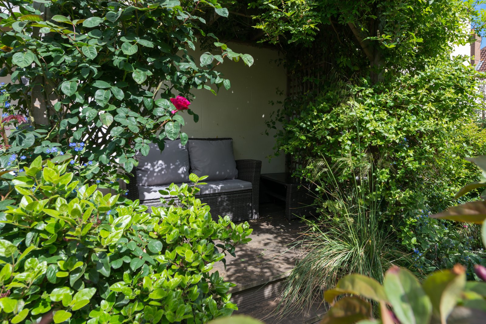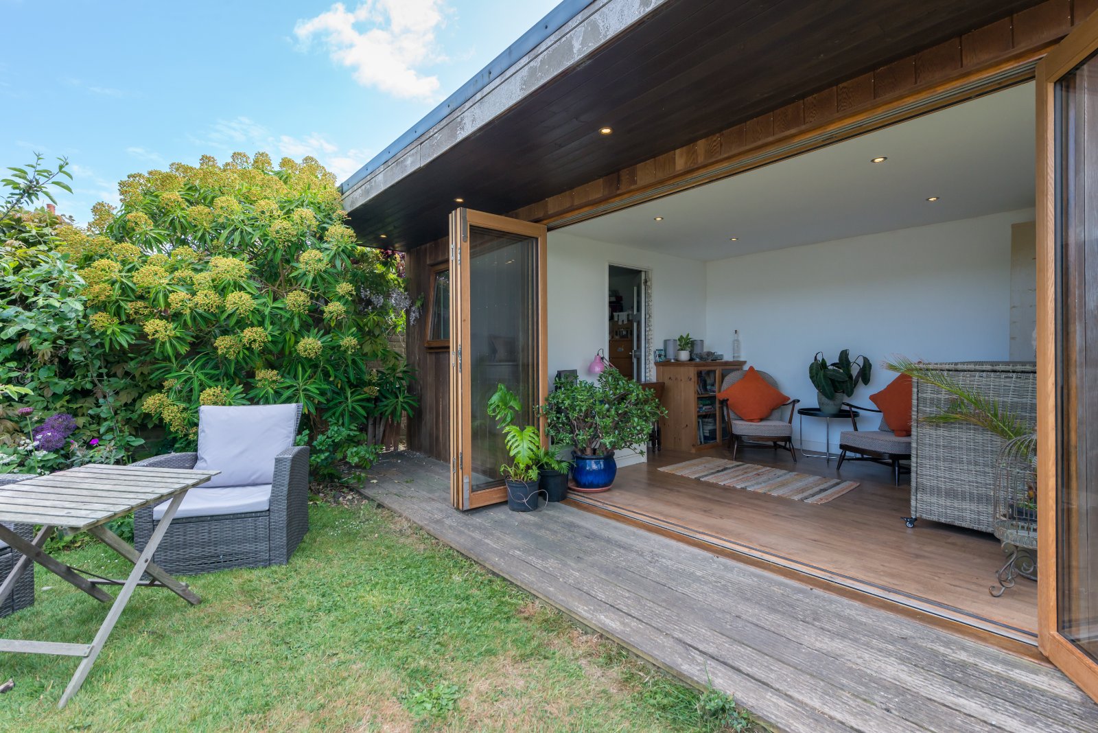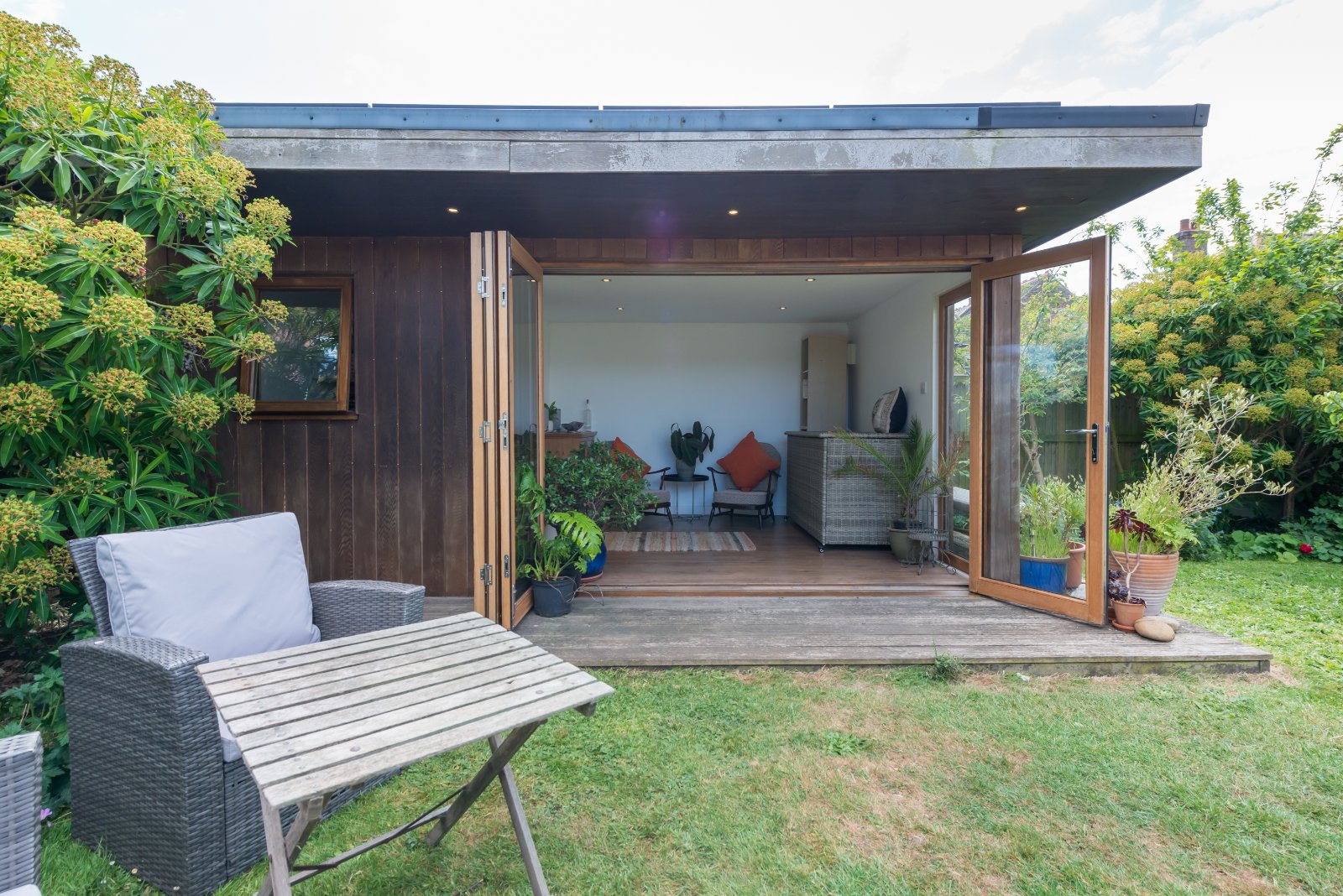 The generous side and rear gardens are a standout feature. The private rear garden is mainly laid to lawn, with a small raised deck pergola for additional seating and framed by mature shrubs and bushes. A large terrace provides an ideal and secluded spot for al fresco dining. Tucked within the garden is a large, cabin style outbuilding, fully powered, ideal as a home office, studio or creative workspace. Solar panels on the roof provide power for the whole house.