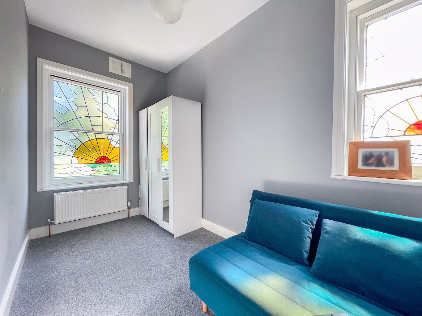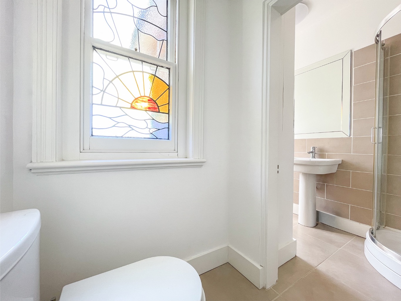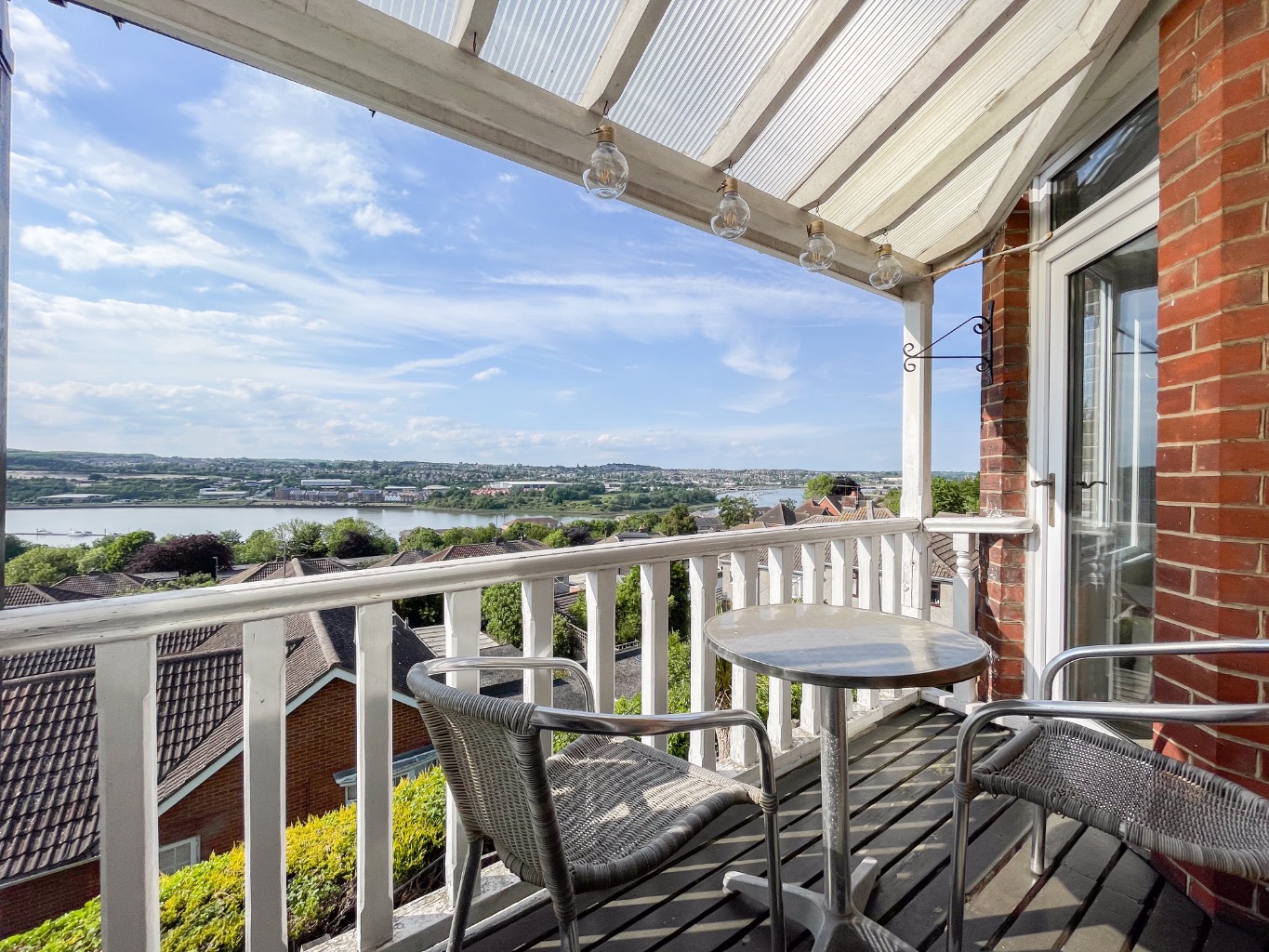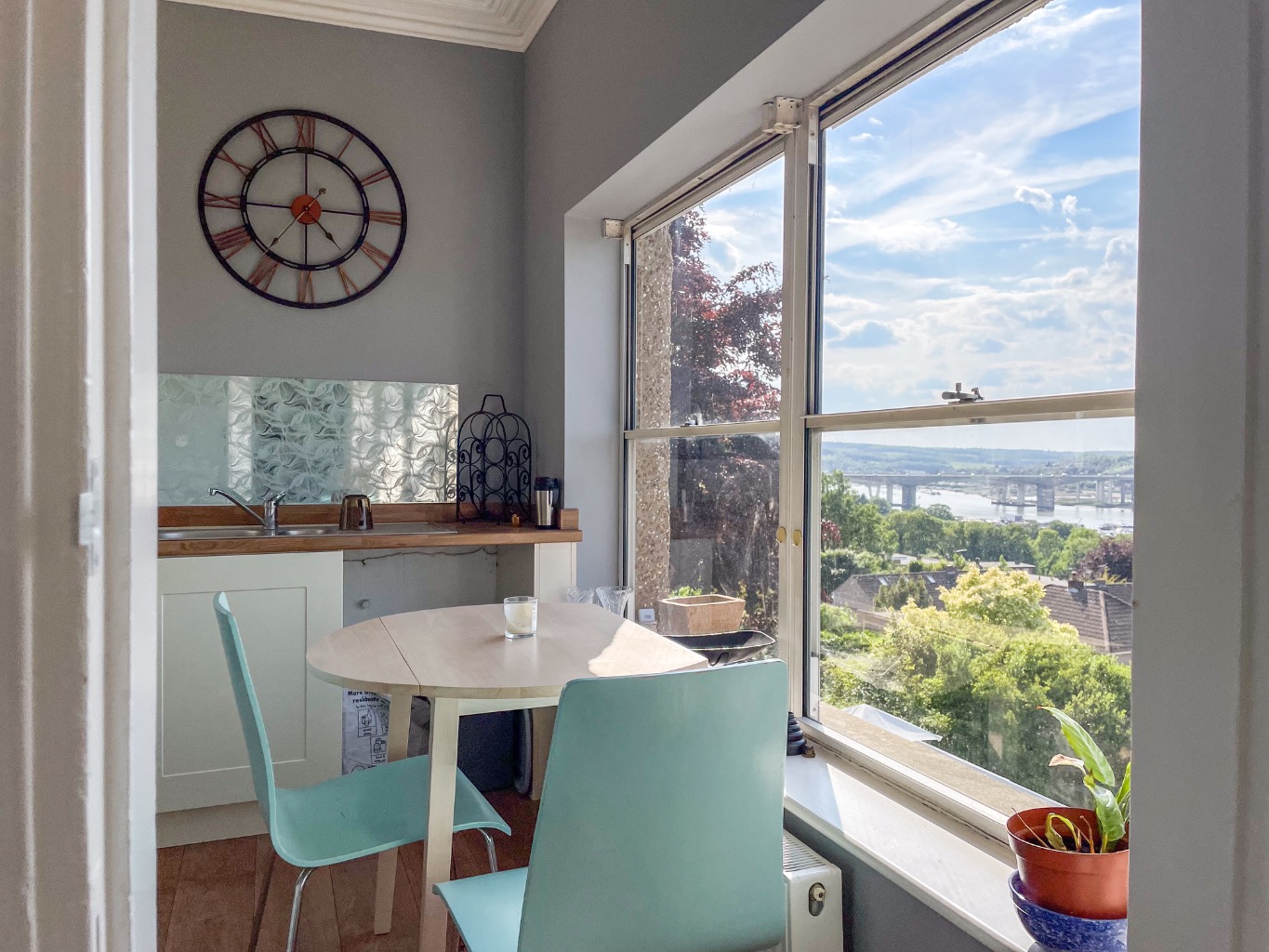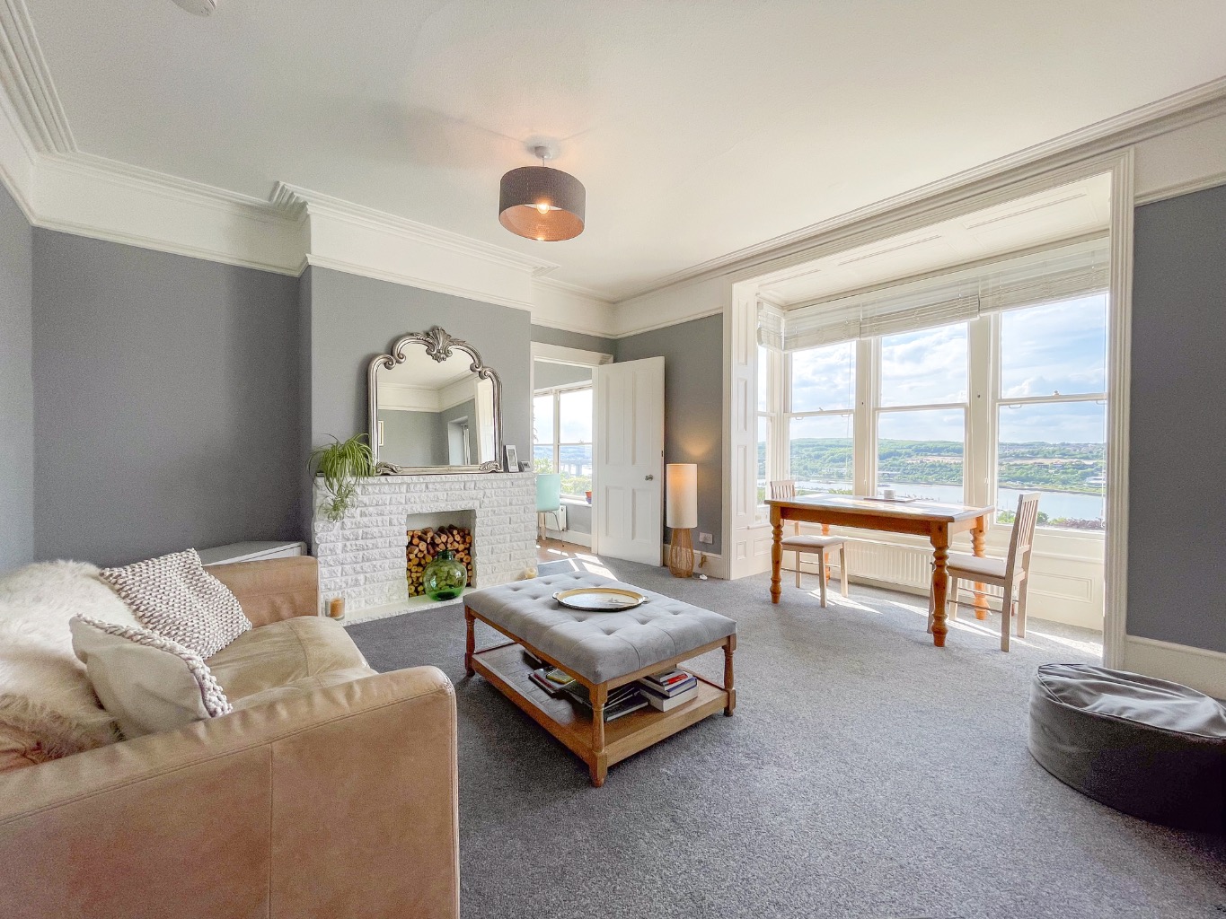 The spacious lounge and modern kitchen both enjoy breathtaking river views through large windows, creating a bright and uplifting living space. The kitchen is fitted with integrated appliances, while the shower room is stylish and contemporary. Modern comforts such as gas central heating blend seamlessly with charming period features including decorative plaster cornicing, picture rails, and stunning stained glass sash windows.