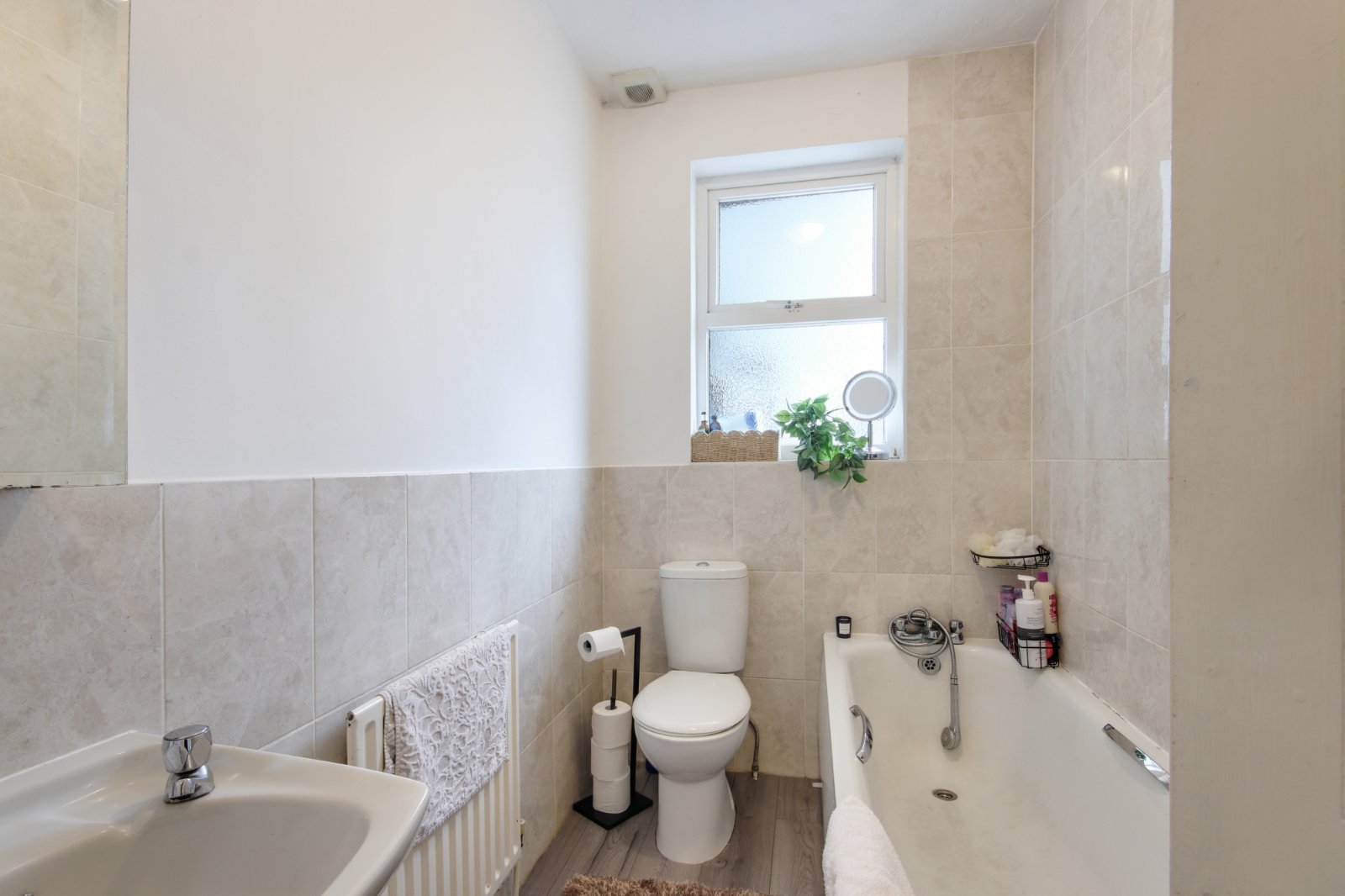Bathroom 8'3" x 5'8" (2.51m x 1.73m). Double glazed frosted window to rear. Wood effect flooring. Textured ceiling. Radiator. Panelled bath with shower attachment. Low level WC. Wash hand basin. Part tiled walls.