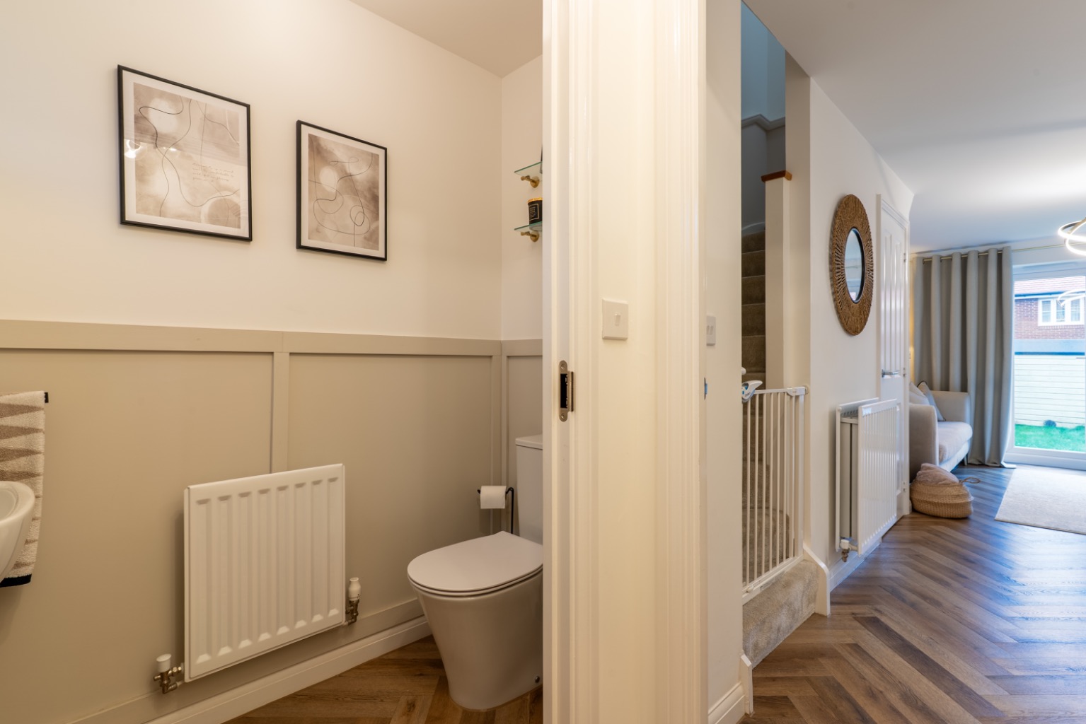 The ground floor boasts a bright, modern open-plan living room and kitchen, perfect for everyday living and entertaining, complete with contemporary fittings and a convenient downstairs WC. To the rear, a low-maintenance garden with an artificial lawn and patio provides a perfect space to relax or host guests.
