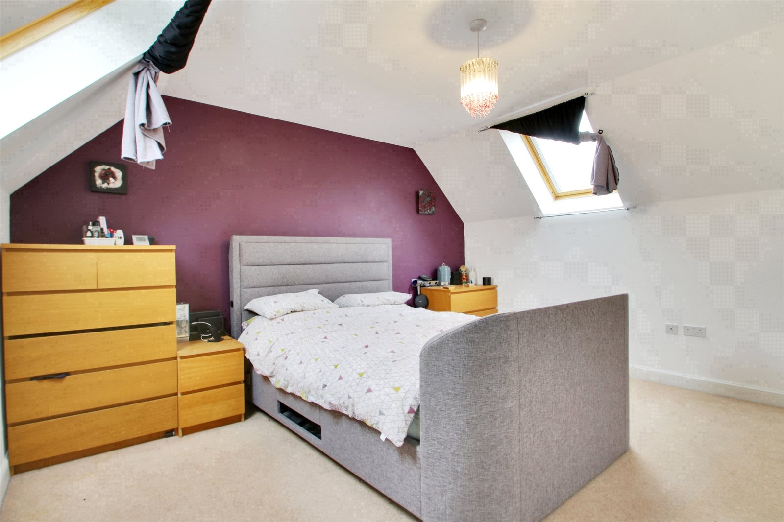Master Bedroom 16'1" (4.9m) x 13'10" (4.22m) narrowing to 12'8" (3.86m). A double aspect room with loft windows to front and rear. Range of built-in wardrobe cupboards.