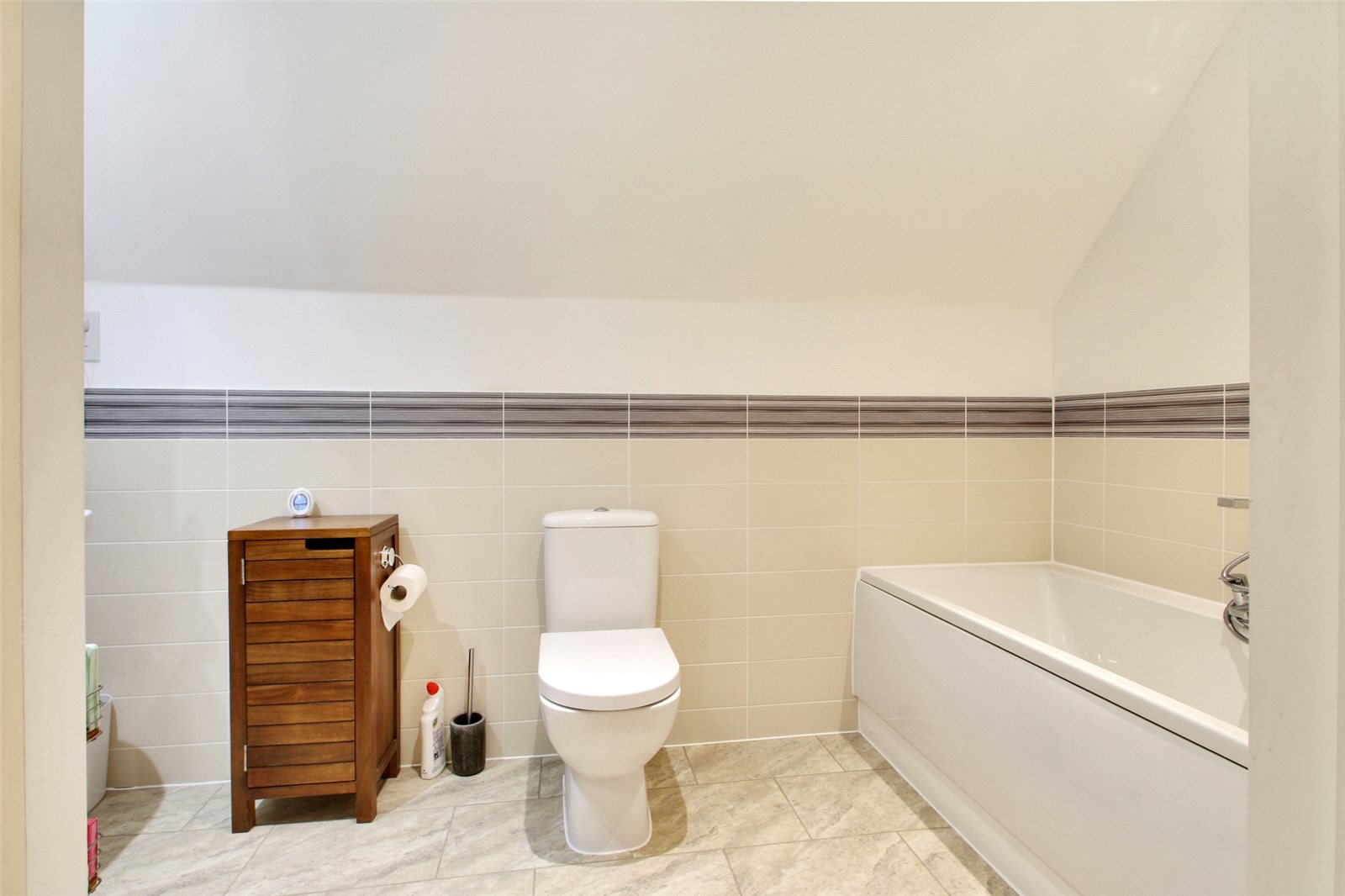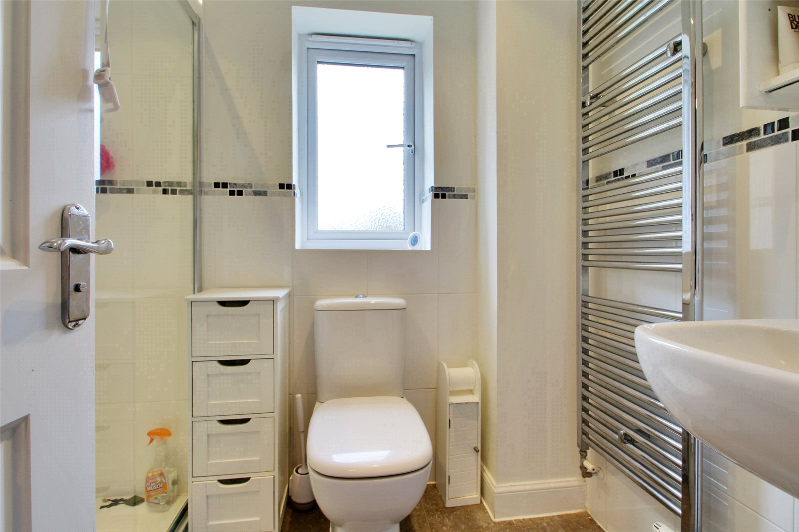Cloakroom Comprising vanity wash hand basin with cupboards under. Close coupled wc. Radiator.