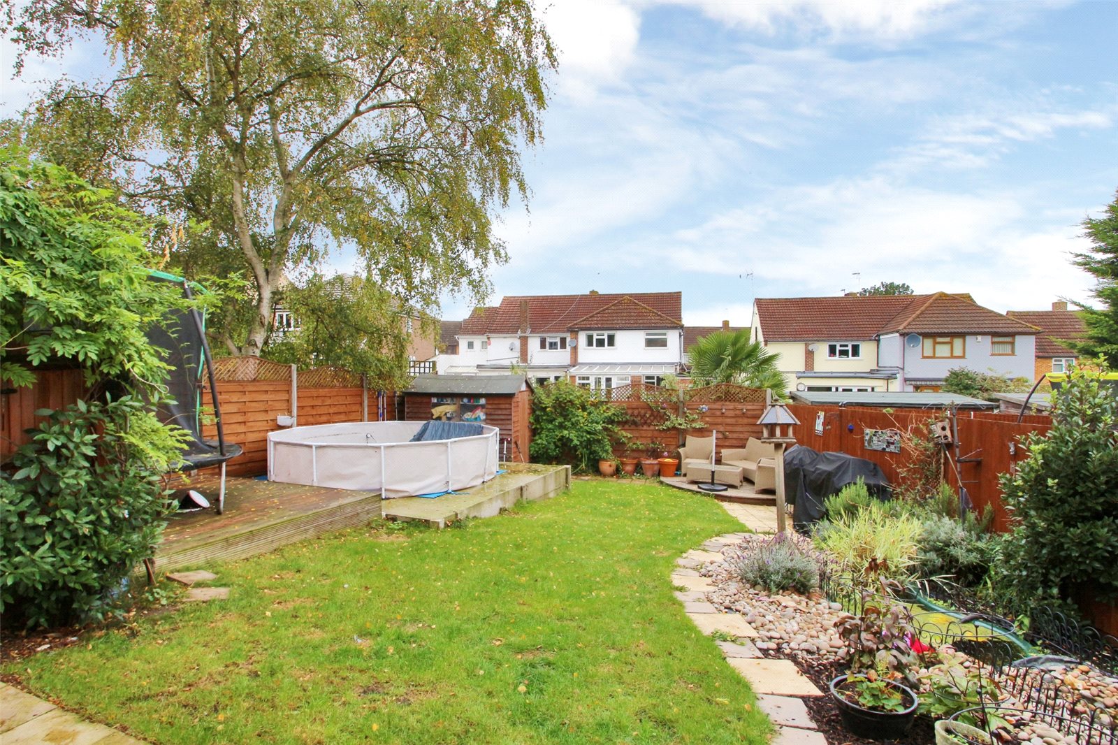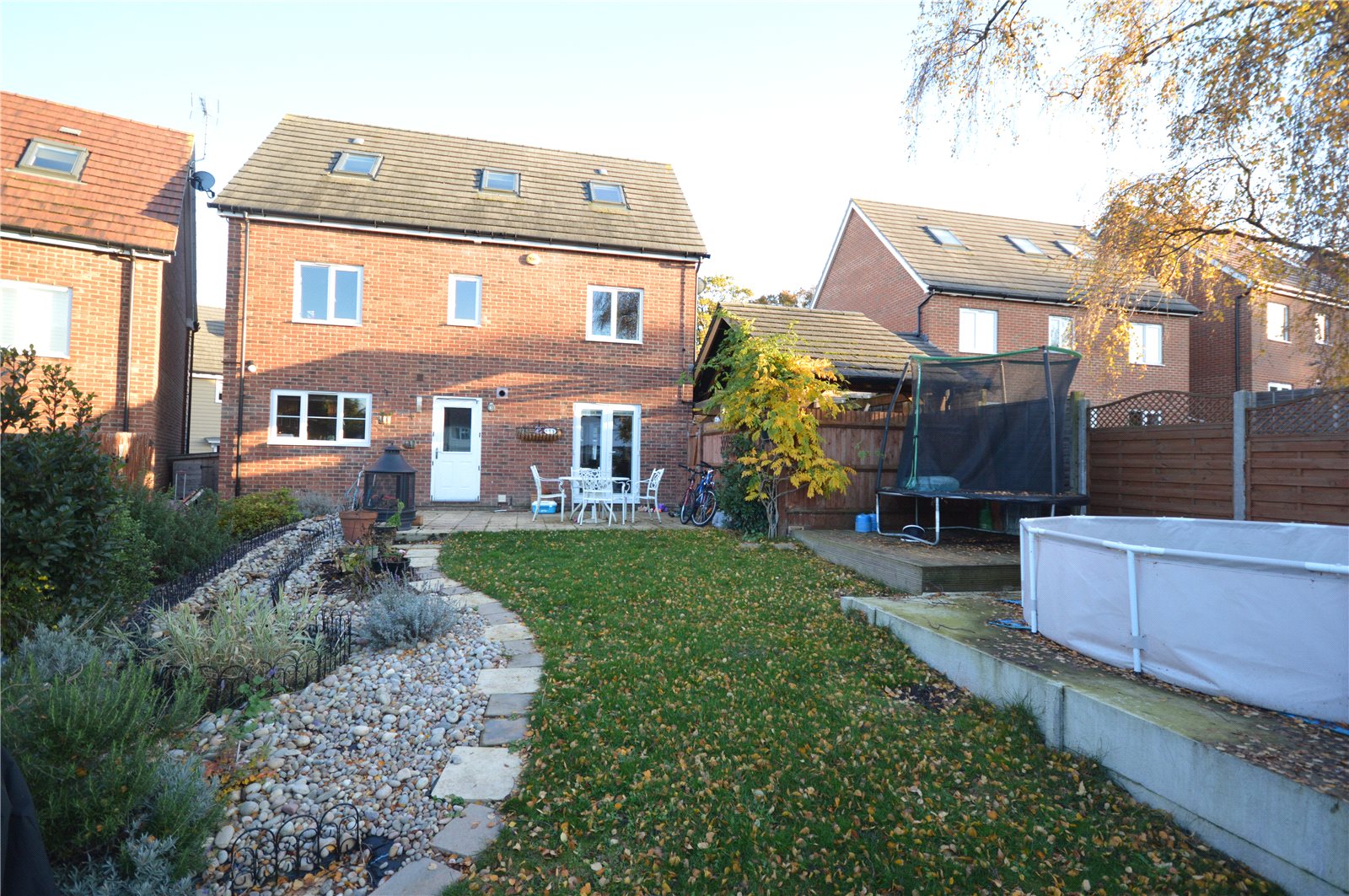 Rear Garden 53 ft. West facing rear garden with wide patio area leading to gardens laid to lawn. Further decked area to rear. Hard standing for pool and climbing frame. Ornamental pond with stream. Outside lights water tap.