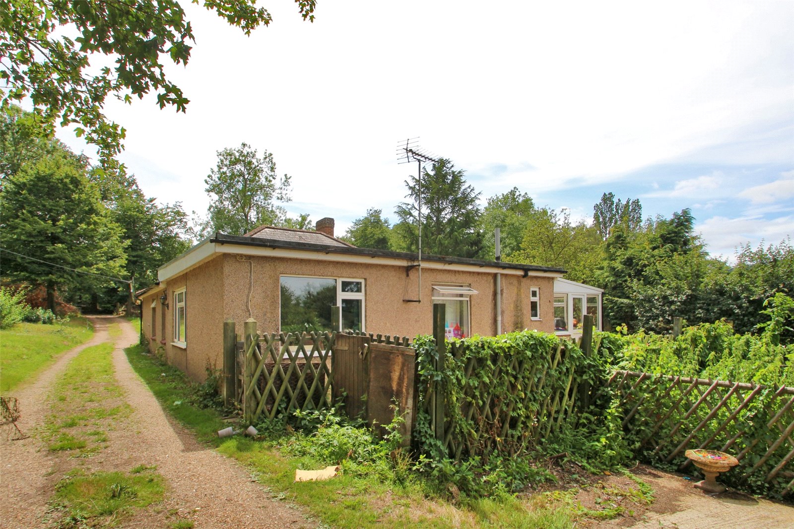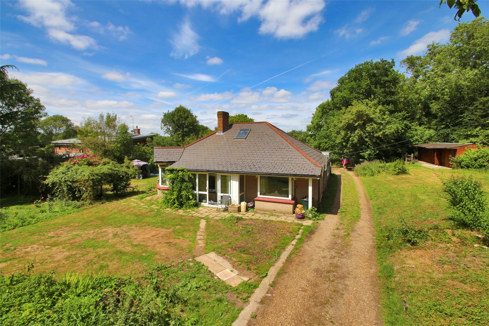 Set in this sought after tranquil position of New Barn, along a private road this large detached bungalow sits in the centre of established grounds approaching one acre. Permitted development rights apply to this property to extend to both ground floor and loft space including velux windows, potentially giving the buyer 460 sqm as shown on our floorplan and gives the opportunity for a purchaser to create a stunning family home. Currently accommodation requires modernisation comprising of spacious reception hallway, lounge and kitchen/breakfast room. There are four bedrooms with master bedroom en-suite, utility room and study. Outside is ample parking and stable block. Permitted development rights are intact for this property meaning outbuildings can be added and do not require further permissions.