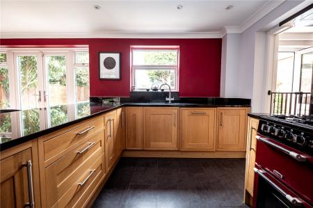 Kitchen/Dining Room 18'9" x 11'7" (5.72m x 3.53m). Double glazed window to rear. Double glazed French doors to rear with double glazed windows to either side. Tiled flooring and wood effect flooring. Plain ceiling with downlights. Fitted wall and base units with granite work tops over, breakfast bar and upstands. Inset sink with mixer taps. Leisure gas range with filter hood over. Integrated dishwasher.