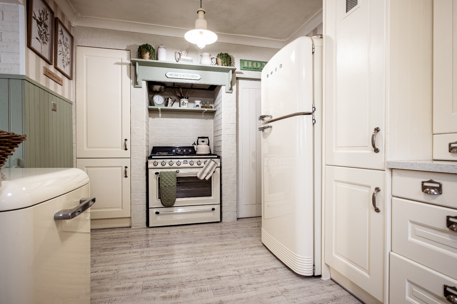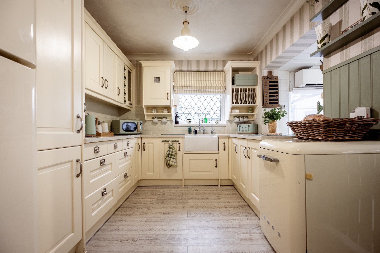 Kitchen 15'10" x 9' (4.83m x 2.74m). Double glazed leaded light effect window to side. Karndean wood effect flooring. Plain cove ceiling. Two ceiling roses. Radiator. Fitted wall and base units with quartz work tops over. Cupboard housing Zanussi boiler. Smeg gas range. Butler sink with mixer taps. Space for fridge freezer. Space for dishwasher. Water softener.