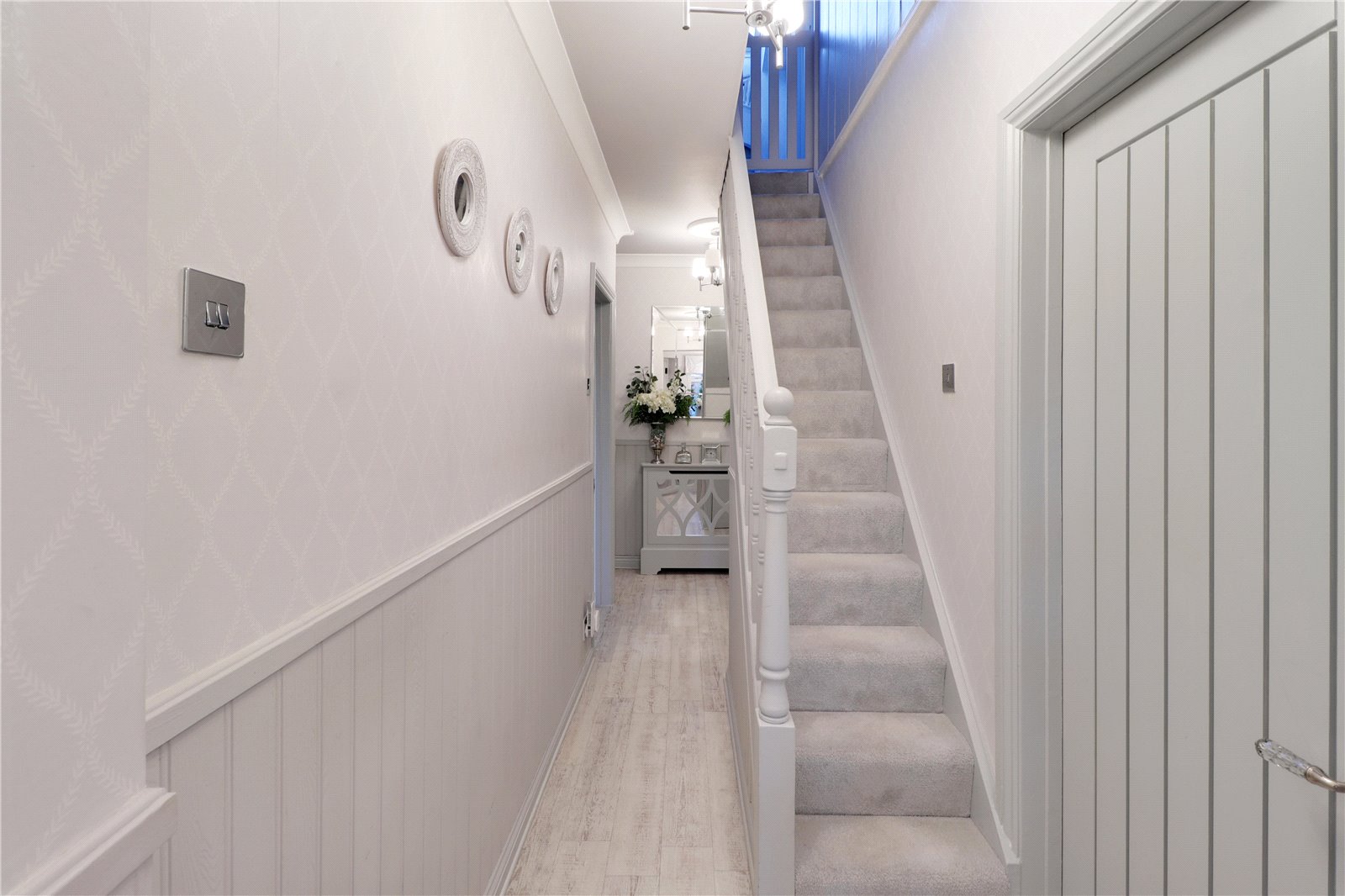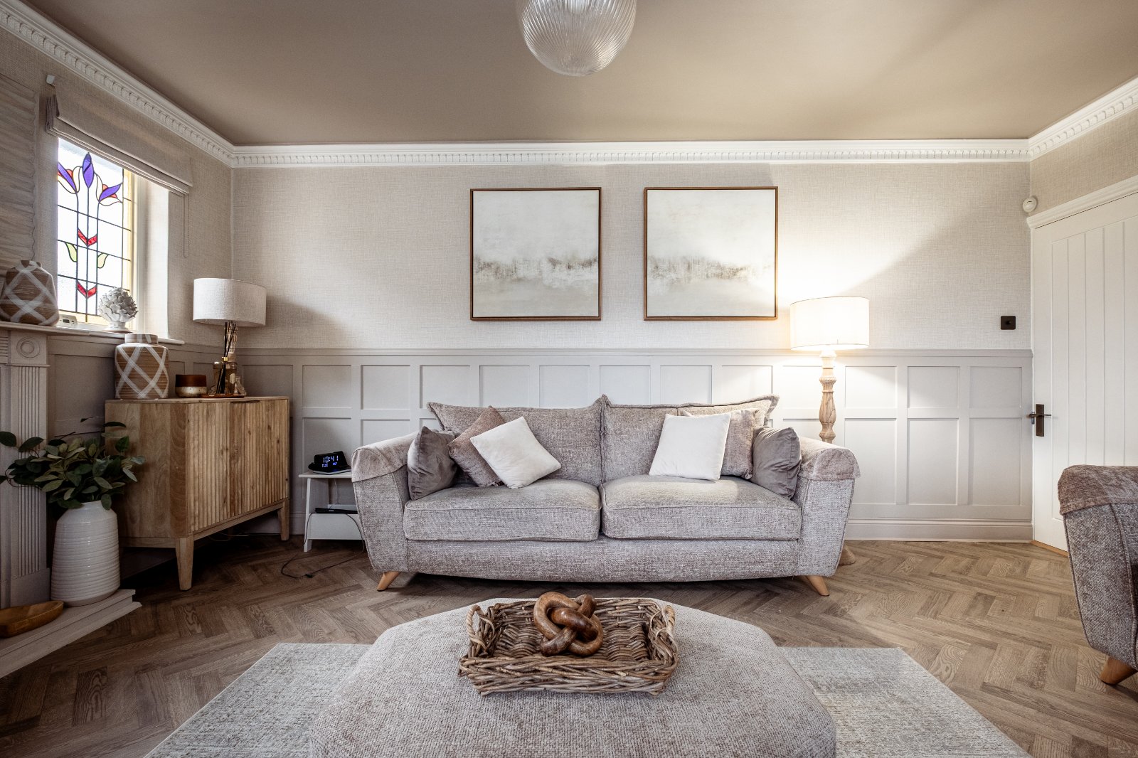 Entrance Hall Stable door to front. Double glazed leaded light effect window to front. Karndean wood effect flooring. Plain coved ceiling. Radiator with cover. Panelled walls. Stairs leading to landing. Radiator and cover.