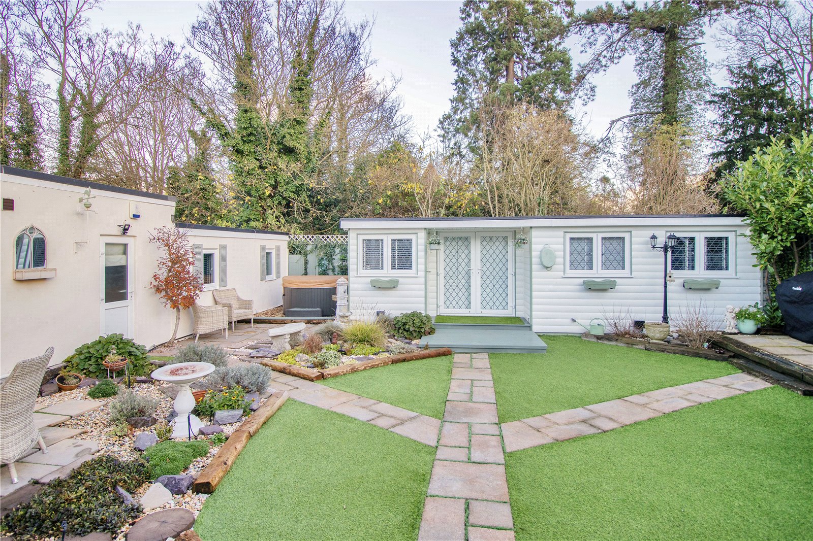 Rear Garden Patio area. Artificial lawn. Side patio area. Wendy house. Hot tub. Outside tap. Two side accesses.