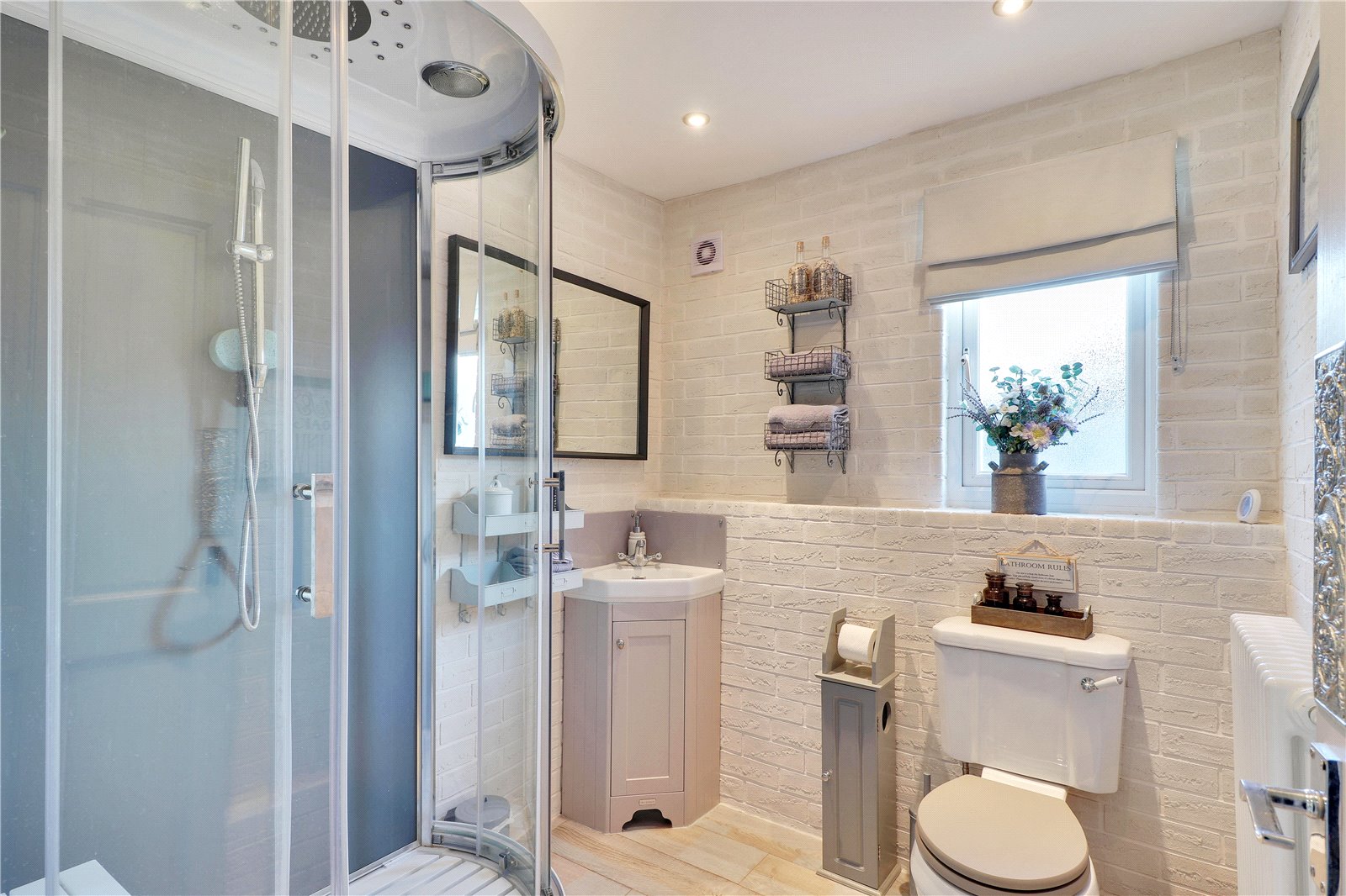 Shower Room 7' x 6'6" (2.13m x 1.98m). Frosted double glazed window to side. Wood effect flooring. Plain ceiling. Down lighters. Extractor fan. Radiator. Low level W.C. Shower. Wash hand basin with vanity unit.