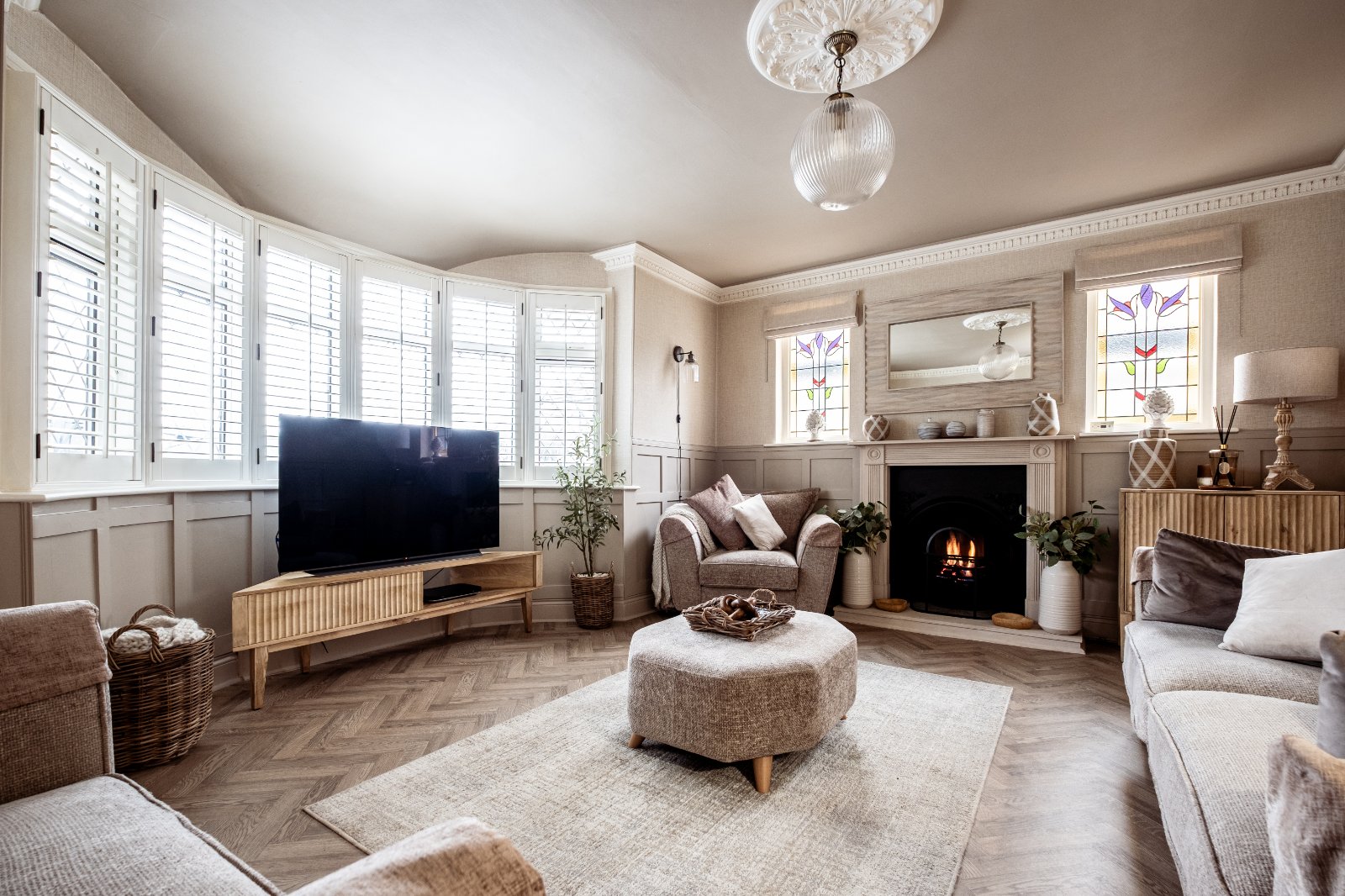 Sitting Room 16'10" x 14'9" (5.13m x 4.5m). Double glazed leaded light effect window to front. Two stained glass windows to side. Karndean wood effect flooring. Radiator. Plain coved ceiling. Ceiling rose. Radiator. Feature period style fireplace and gas fire.