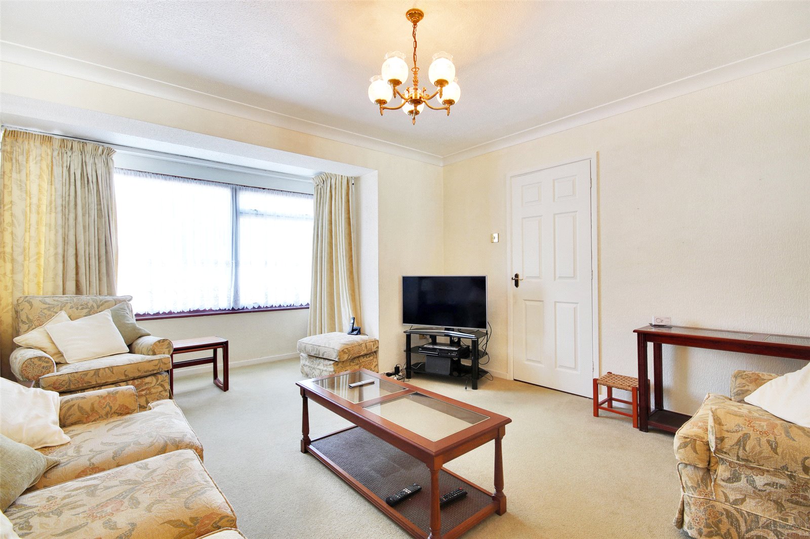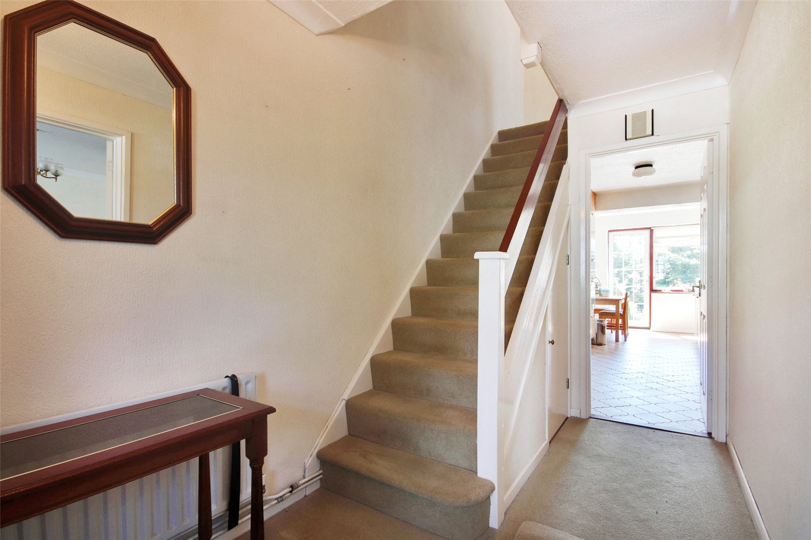 Entrance Hall Panelled door to front with frosted panelled glazing. Full length frosted glazed window to side. Carpet. Textured coved ceiling. Radiator. Stairs leading to landing with understairs cupboard housing meters.
