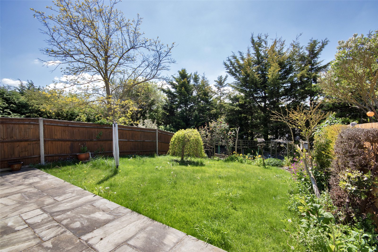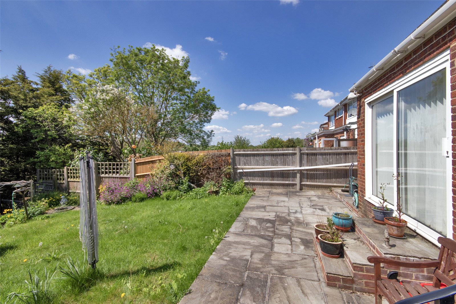 Rear Garden Paved patio area. Lawn area. Flower beds. Lower rear area with shed and greenhouse. Fenced surround.