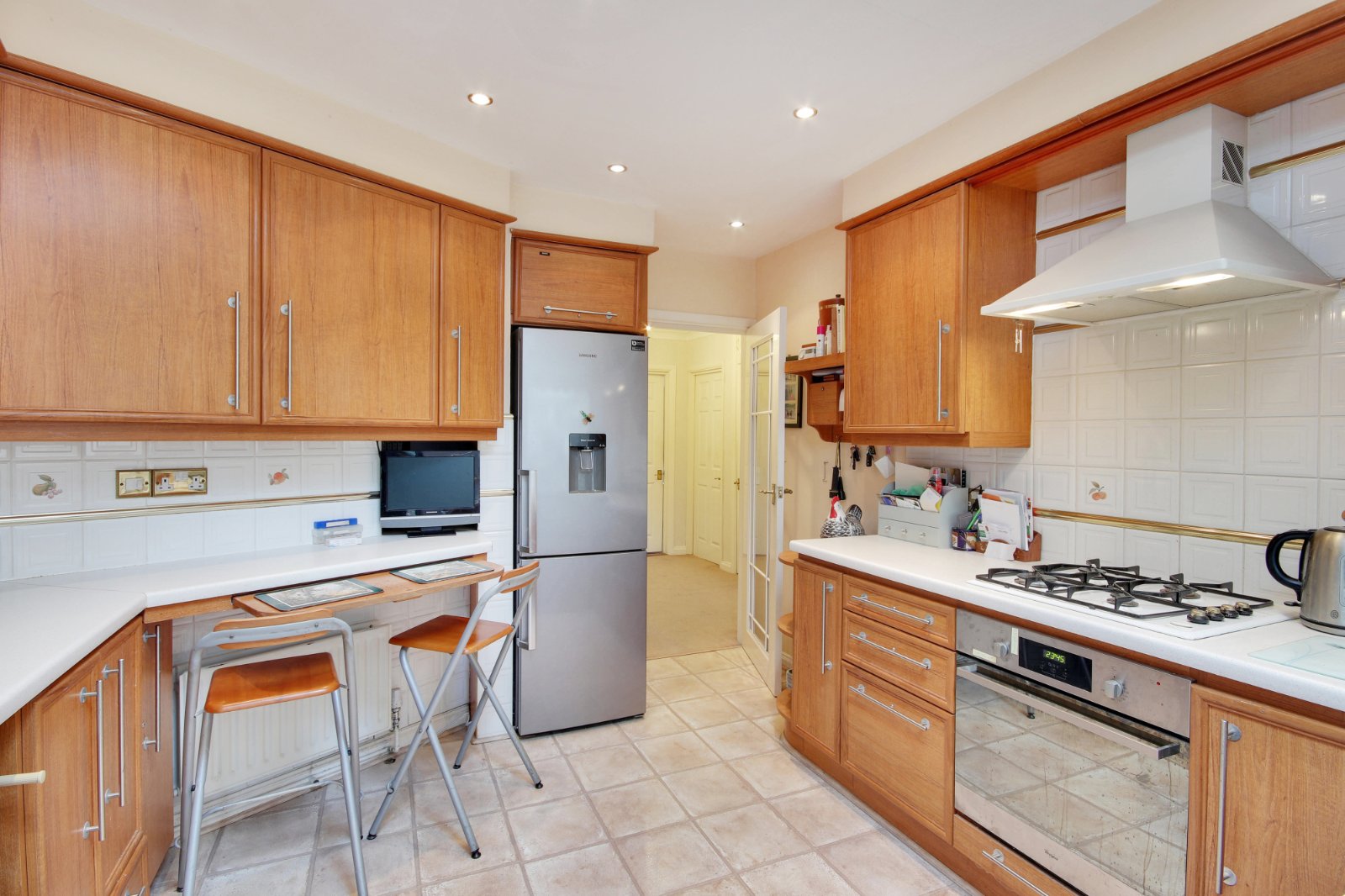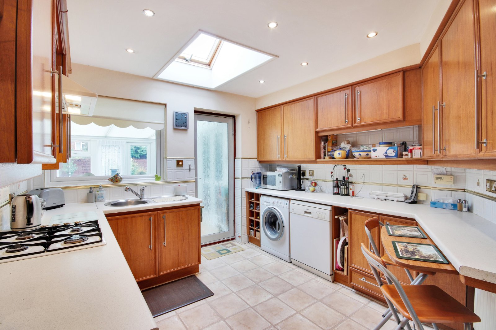 Kitchen/Breakfast Room 12'3" x 10'8" (3.73m x 3.25m). Double glazed window to rear. Double glazed door to rear. Skylight window. Tiled flooring. Plain ceiling with downlights. Fitted wall and base units with breakfast bar and work tops over. Stainless steel sink and drainer unit with mixer taps. Local tiling to walls. Whirlpool gas hob with filter hood over. Oven. Spaces for washing machine and dishwasher.