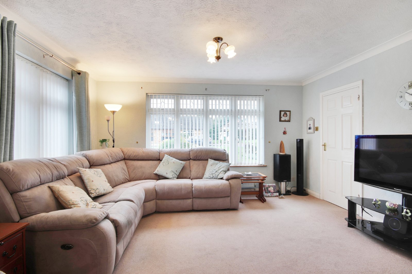 Sitting Room 22' (6.7m) x 14'5" (4.4m) narrowing to 9'3" (2.82m). Double glazed leaded light effect window to front. Double glazed window to side. Carpet. Textured and coved ceiling. Two radiators. Open plan to dining room.