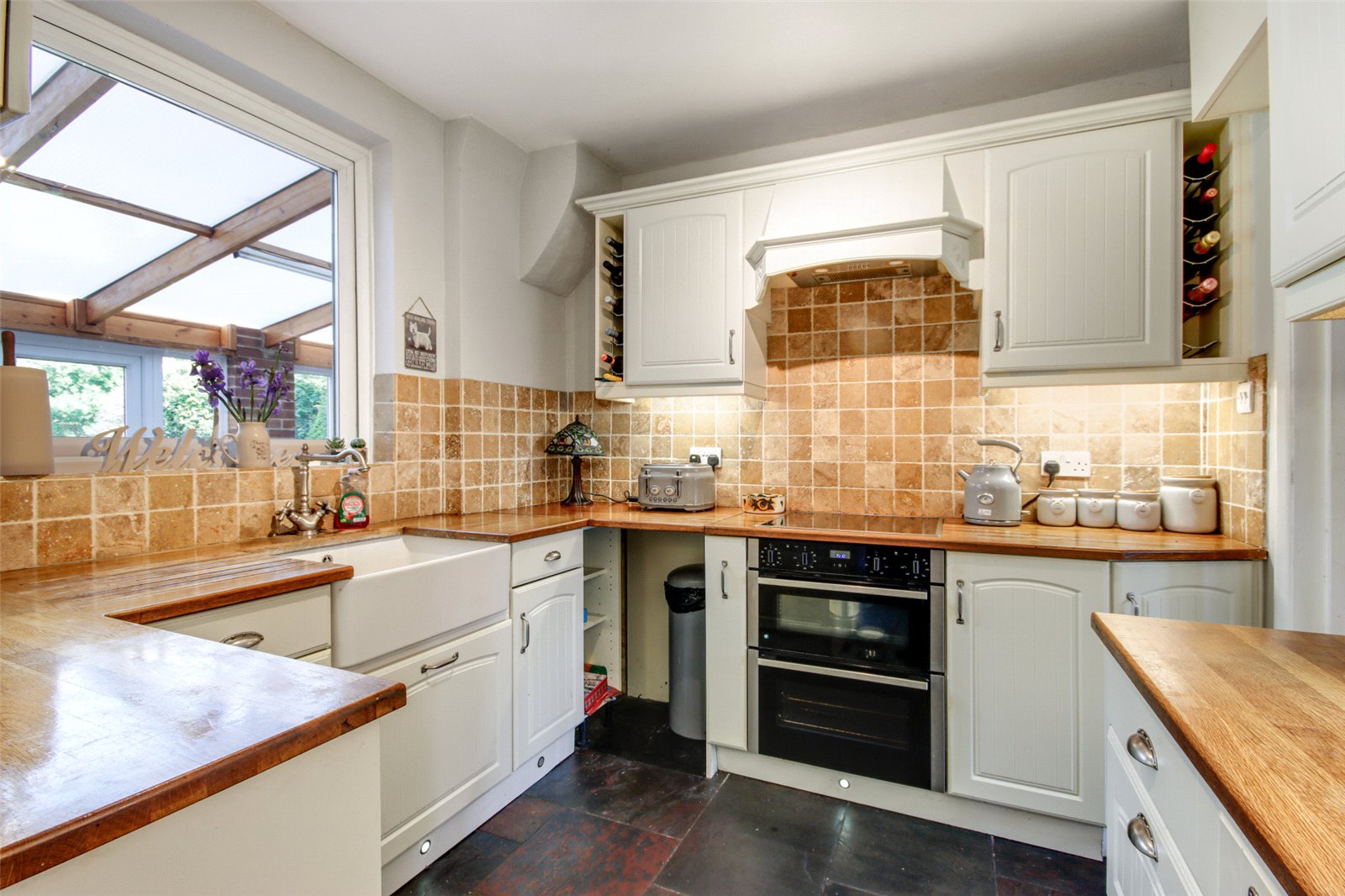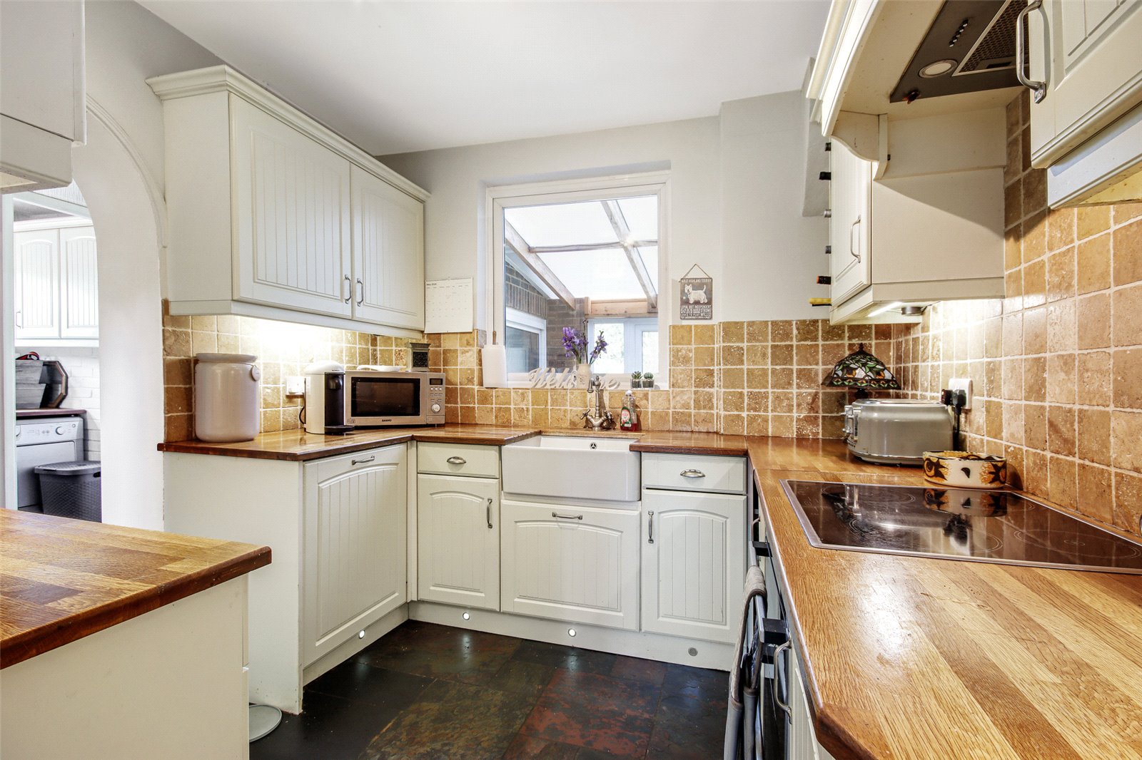 Kitchen 8'7" x 8'5" (2.62m x 2.57m). Double glazed window to rear, range of wall and base units, worktop space, inset butler sink, built in oven with inset hob and extractor over, part tiled walls, slate tiled floor, archway to: