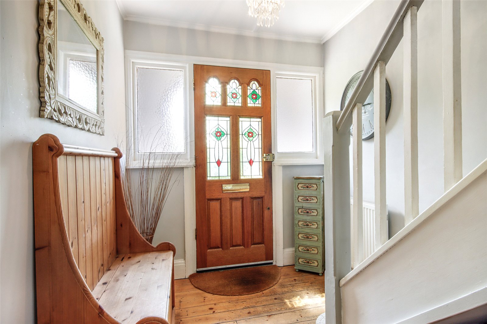 Reception Hall Stairs to first floor, understairs storage area, stripped wood flooring, radiator.