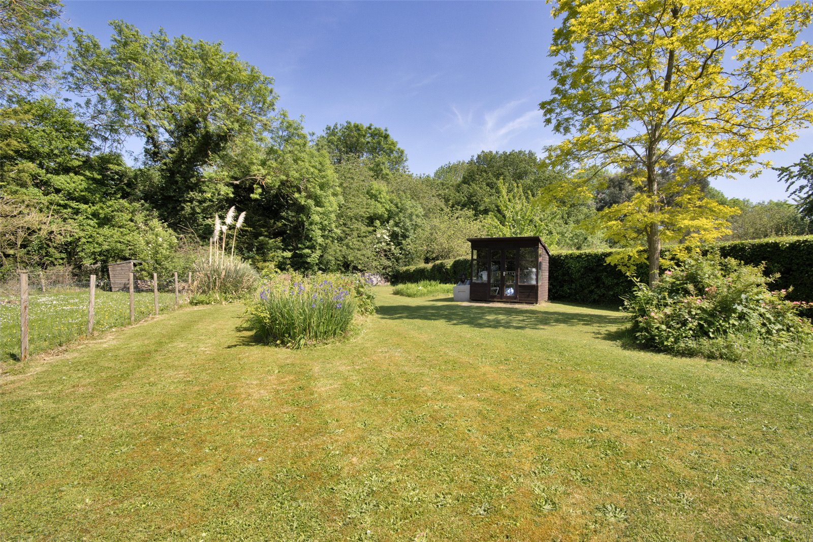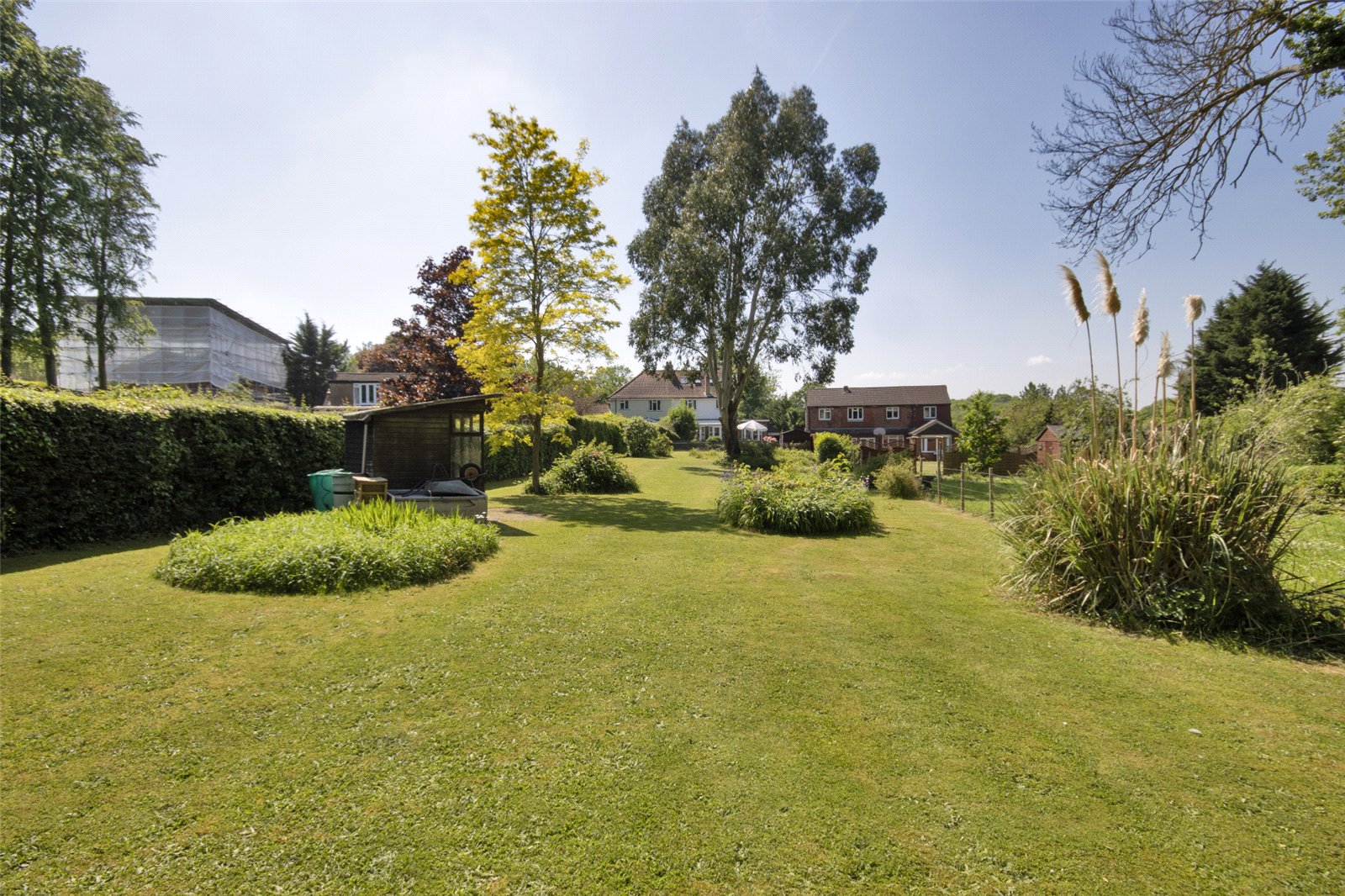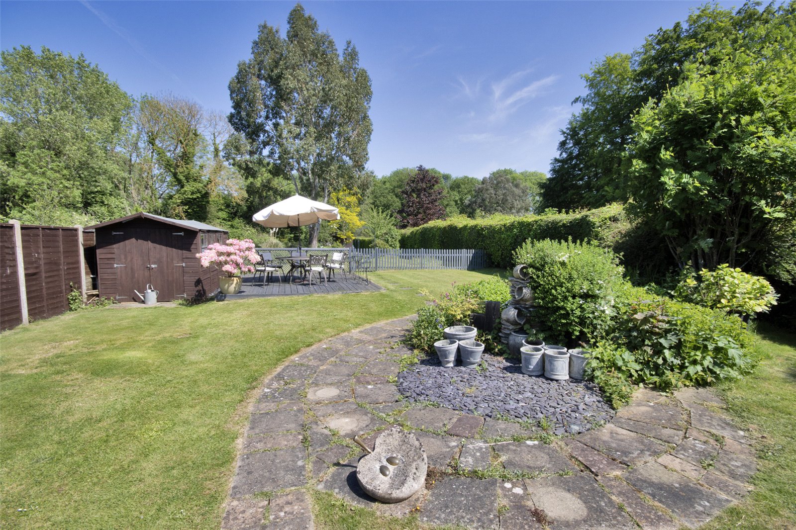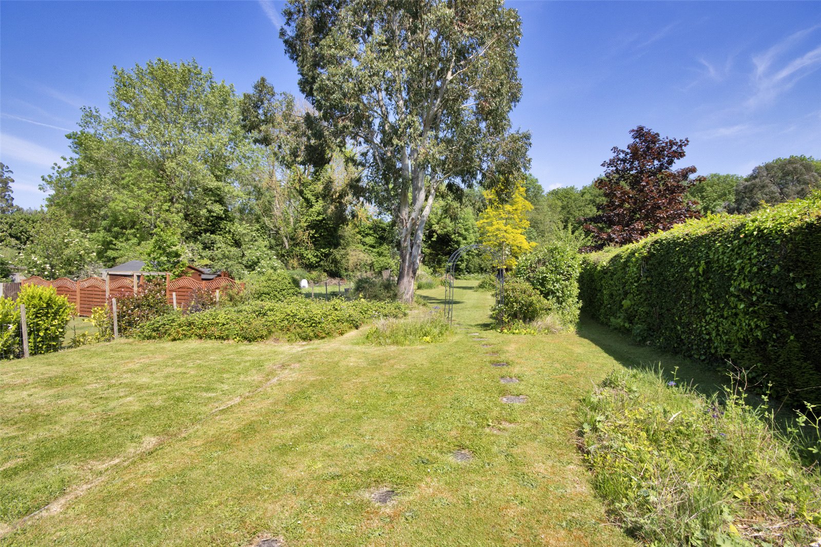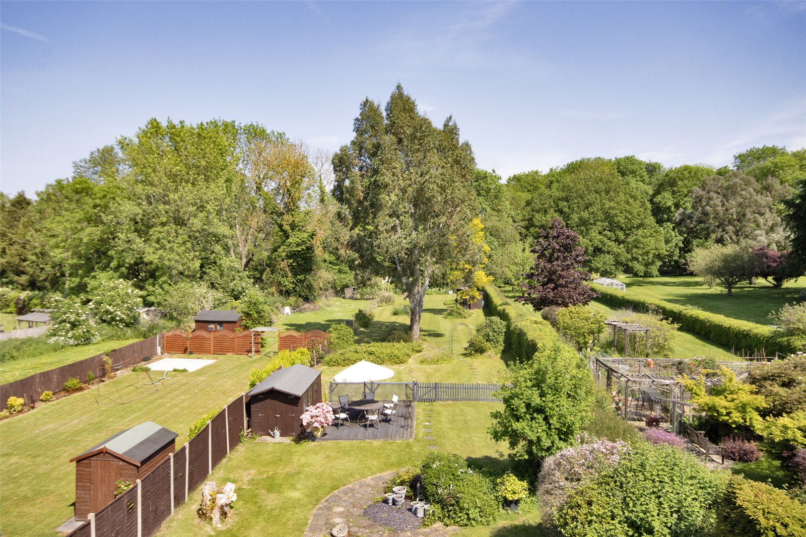 Rear Garden xtending to 310 ft. Laid mainly to lawn with extensive flower and shrub beds, mature trees, fenced and hedged boundaries, garden sheds, side secluded courtyard.
