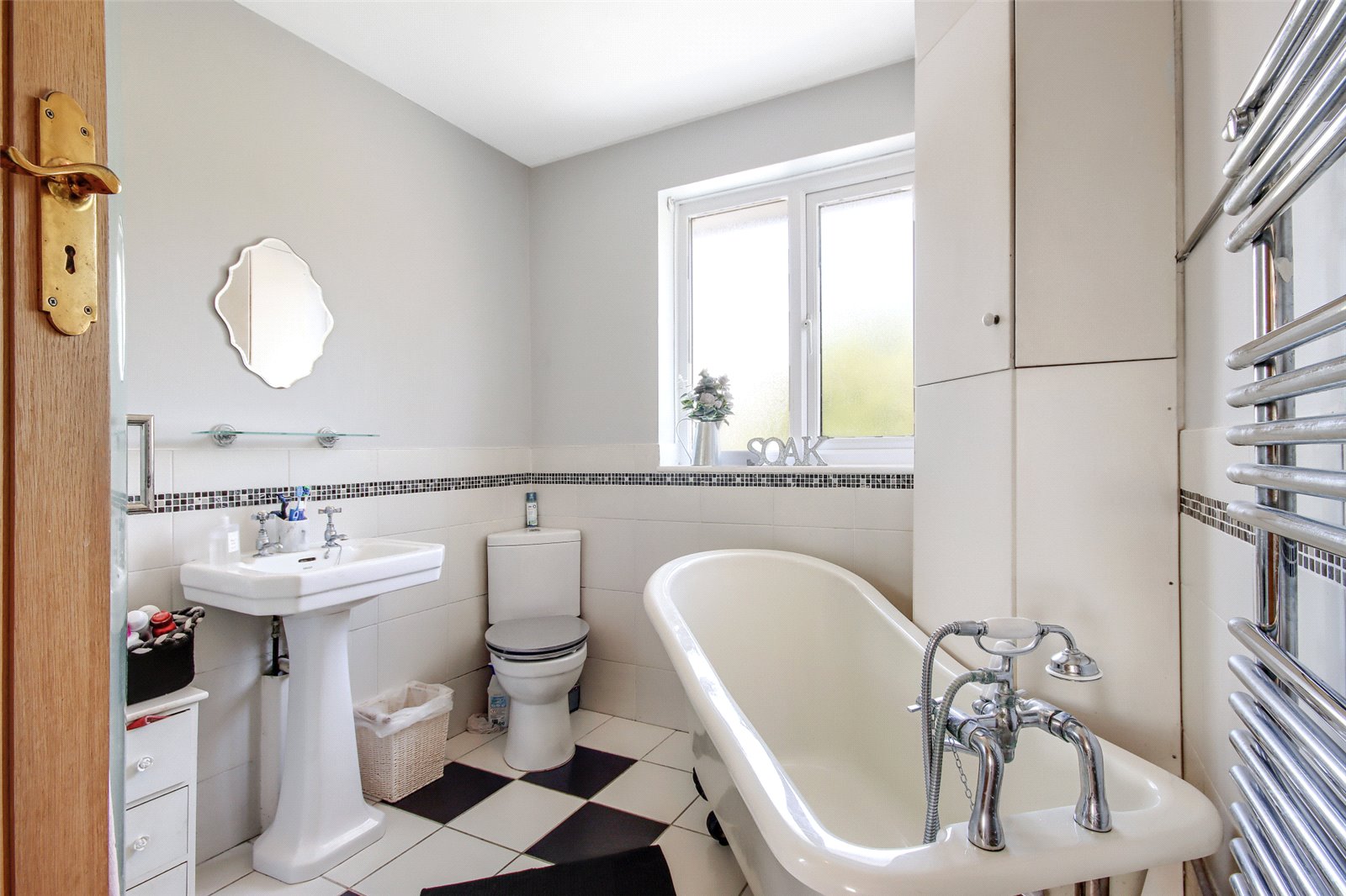 Family Bathroom Double glazed window to rear, freestanding roll top bath, corner shower cubicle, pedestal wash hand basin, low level wc, storage cupboard housing hot water cylinder, tiled flooring, part tiled walls.