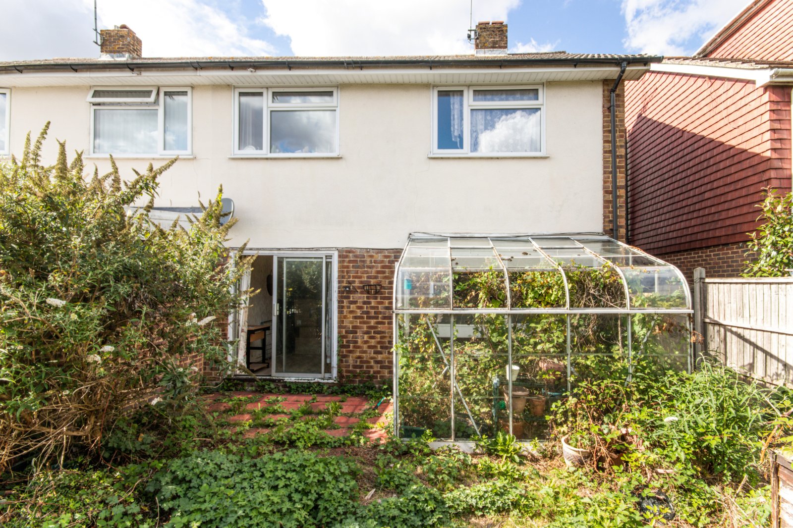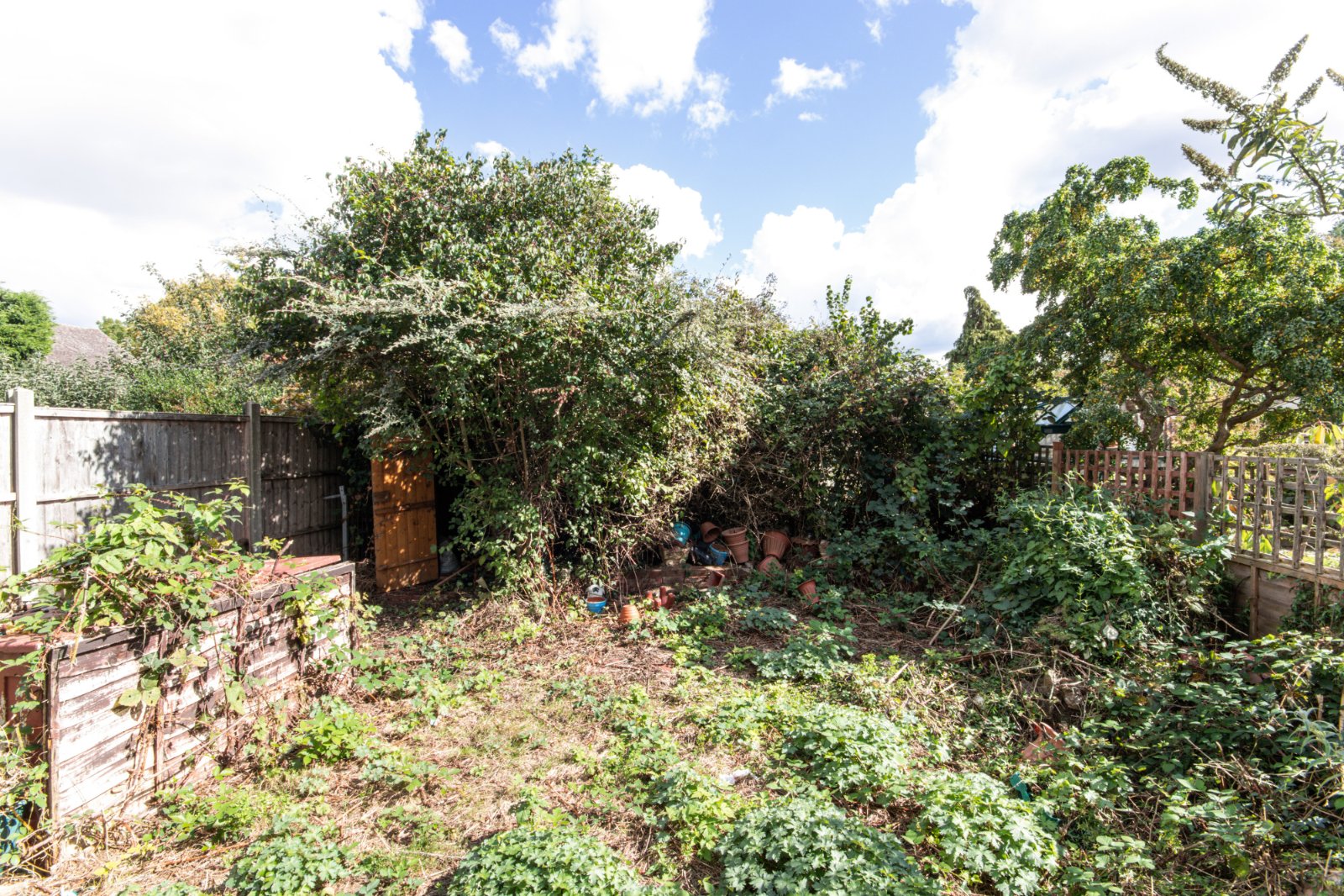 Rear Garden Overgrown. Path. Fenced surround. Side access. Outside tap. Greenhouse. Shed.
