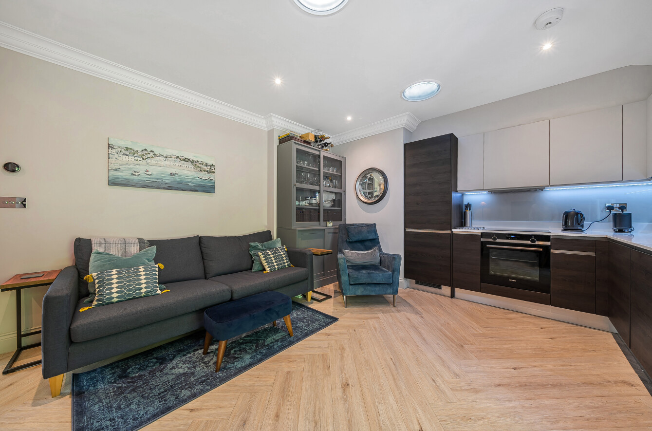 From the well maintained communal entrance, the front door opens into an inviting hallway with a useful storage cupboard and three windows overlooking the central courtyard flooding the space with natural light. All the living accommodation is at the back of the property with views over the private garden. The two bedrooms both have fitted cupboards and one is currently used as a study. The kitchen/sitting room is a sociable living area with double doors leading out into the garden. The kitchen comprises a range of modern fitted wall and base units with integrated appliances. Completing the accommodation is a modern three piece bathroom with ample storage. The property also has the benefit of underfloor heating.
