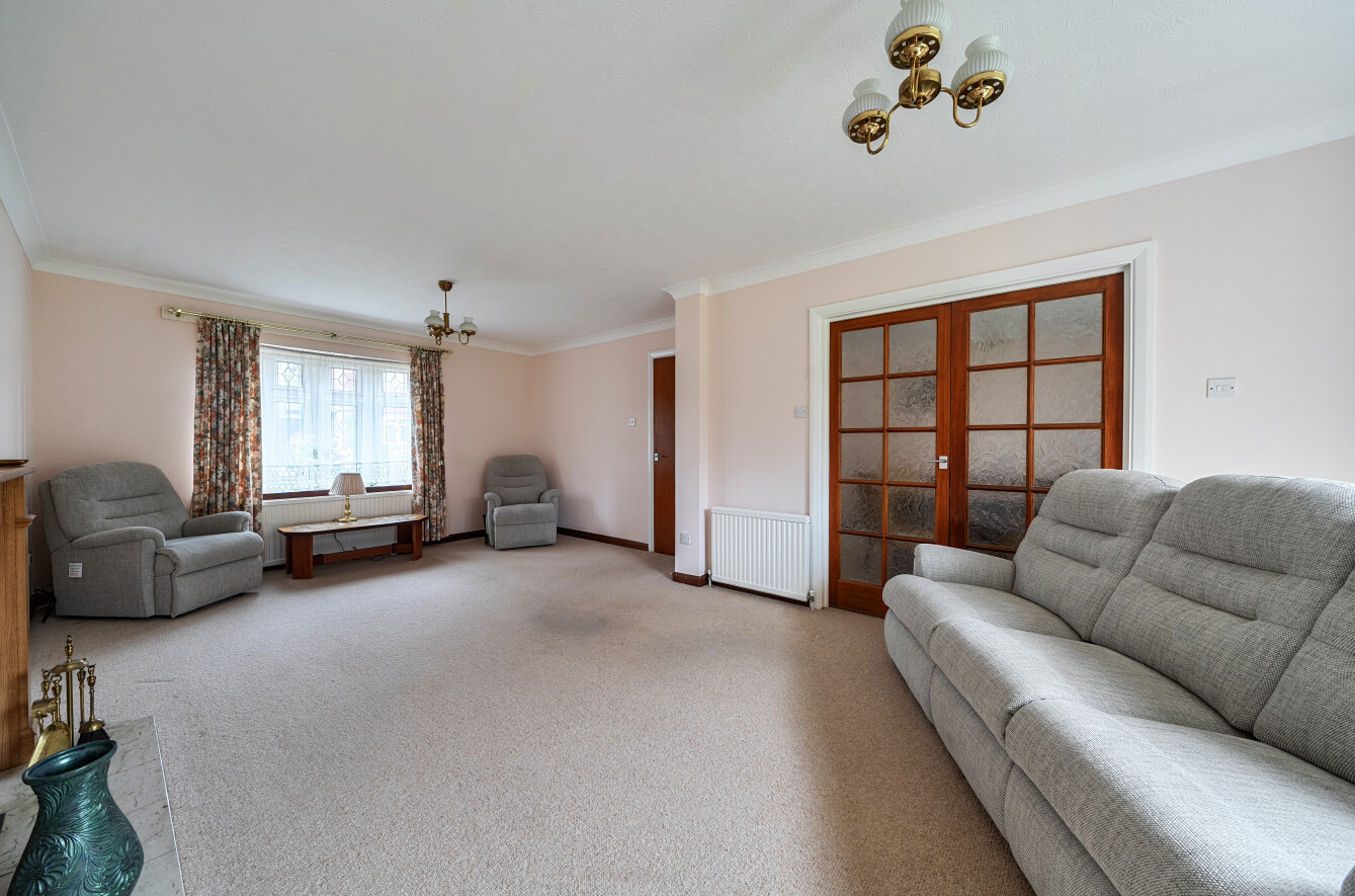 The spacious double aspect living room has patio doors opening out to the rear garden and double doors leading into the separate dining room.