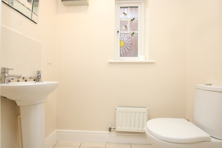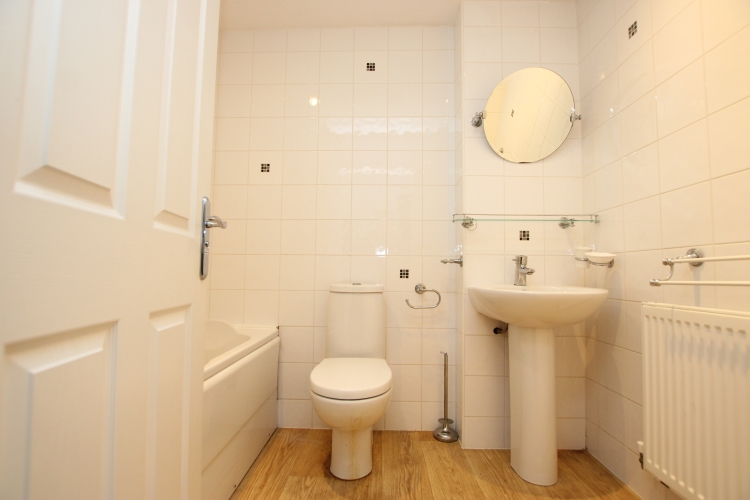 Tiled surrounds, bath with shower attachment, pedestal wash basin, low-level W/C, radiator