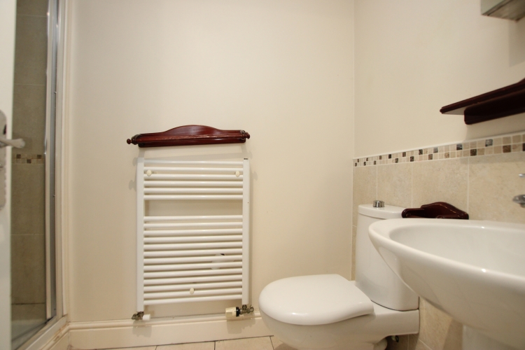 Tiled surrounds, shower cubicle, pedestal wash basin, low-level W/C, heated towel rail, tiled flooring, towel rail radiator