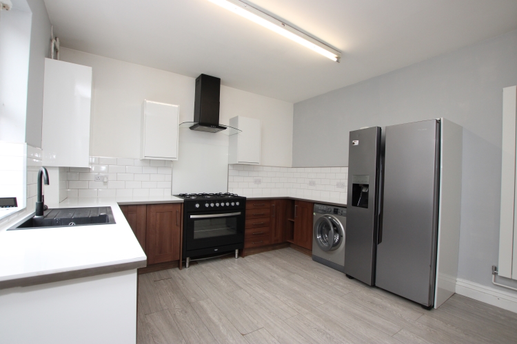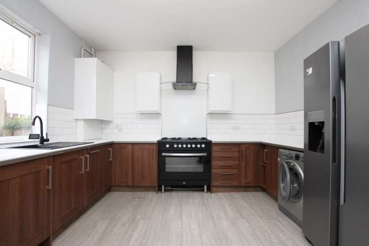 Range of modern wall and base units, worksurface incorporating sink with drainer, 5-ring gas hob and oven, integrated extractor hood, integrated dishwasher, integrated dual fridge-freezer, space for a washing machine, boiler-system, double glazed window to front aspect, vertical radiator, understairs storage cupboard