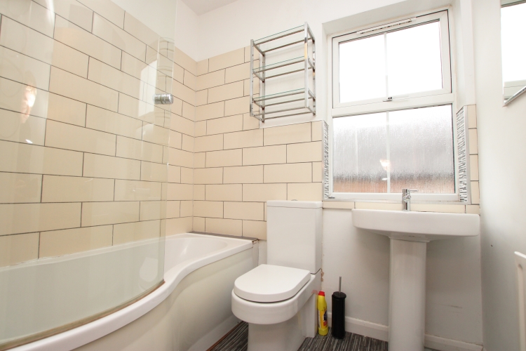Obscure double glazed window to front aspect, bath unit and shower overhead with majority tiled surrounds, pedestal wash basin, low-level W/C with part tiled surrounds, radiator