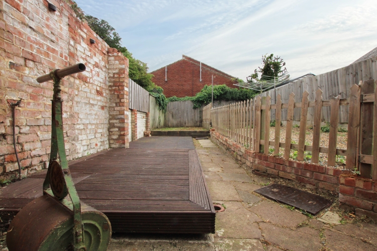 Low-maintenance rear garden with a Store (2.40m x 2.35m) providing a useful external brick-built storage space, decking area, raised lawned space, part brick-wall and fenced surrounds, concrete path to shared access gate for bin access and main access to front street