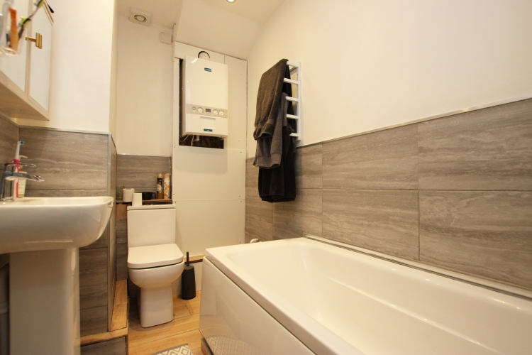 Bath unit with panelled surrounds, pedestal wash basin, low-level W/C, radiator, Worcester boiler system