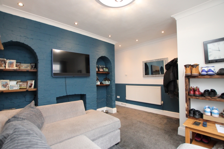 Double glazed window to front aspect, radiator, dual arch and fireplace style brick feature wall