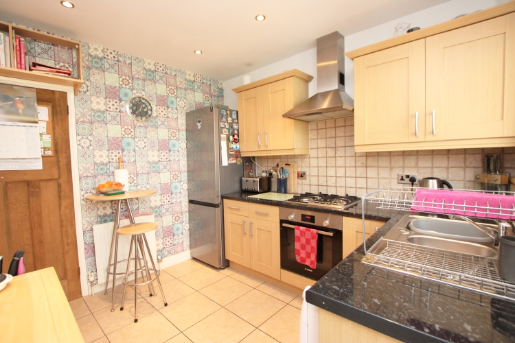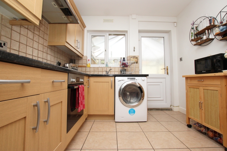 Double glazed window and door to rear aspect, a range of wall and base units, tiled splashback to work surface incorporating a one and a half bowl sink with drainer, Bosch integrated oven, 4x Ring Gas Hob, integrated extractor hood, radiator, space for range of appliances, spotlights, ceramic tile flooring