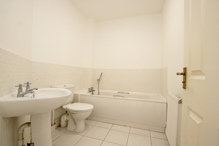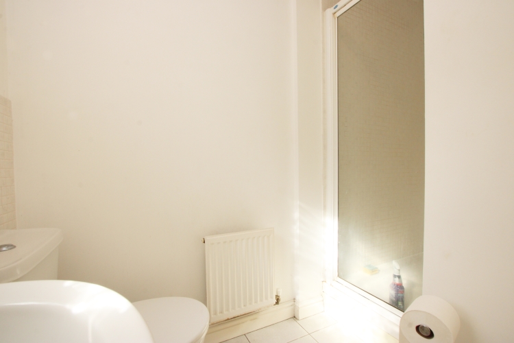 Bath with shower attachment, pedestal wash basin, low-level W/C, tiled surrounds, extractor fan, radiator