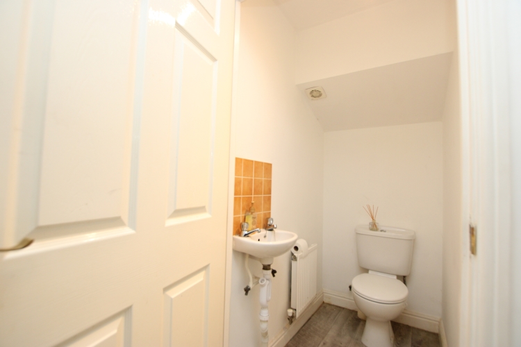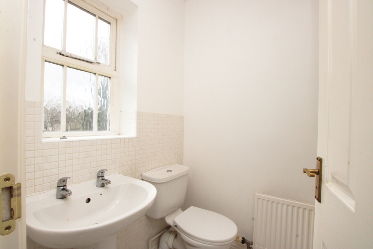 Low level W/C, pedestal wash basin, radiator, extractor fan