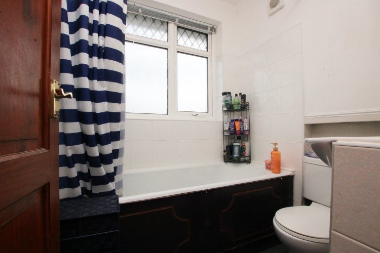 Obscured double glazed window to front, pedestal wash basin, low level w.c, bath with shower attachment, radiator, tiled surrounds
