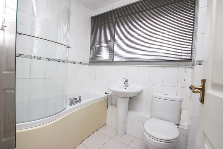 Obscure double glazed window to rear aspect, bath unit and separate electric power shower overhead, pedestal wash basin, low-level W/C, full tiled surrounds, heated towel rail