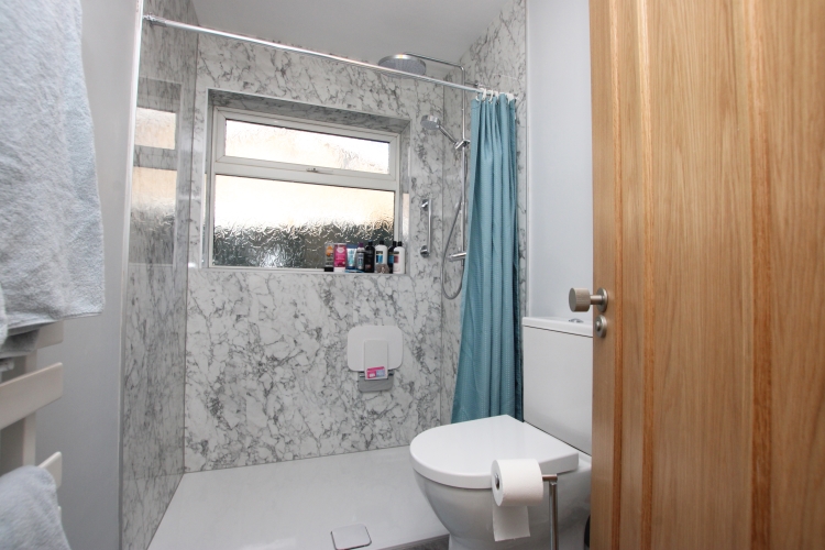Obscure double-glazed window to side aspect, mains walk in shower, vanity wash basin, low-level W/C and heated towel rail, tiled surrounds, tiled flooring