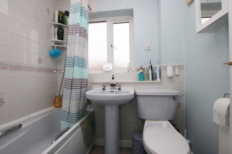 Obscure double-glazed window to rear aspect, bath with shower attachment, tiled surrounds, pedestal wash basin, low-level W/C, radiator