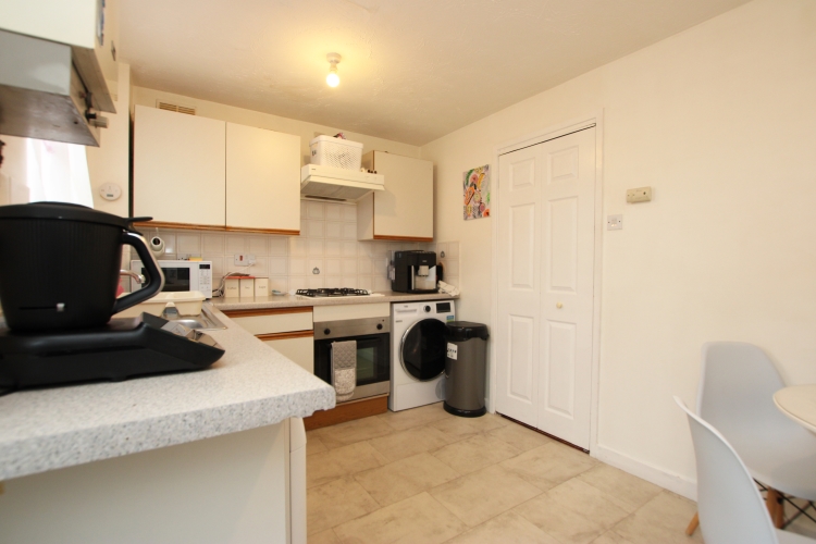 A range of wall and base units, splashback tiled surrounds to work surface incorporating sink with drainer, integrated oven, 4x ring gas hob, extractor hood over, double glazed window to rear aspect, space for a range of appliances, rear door onto enclosed rear garden, boiler