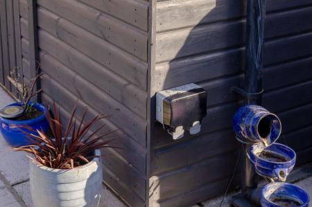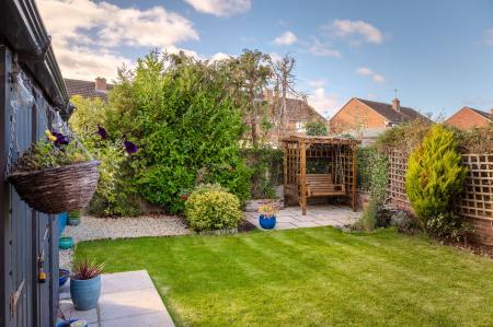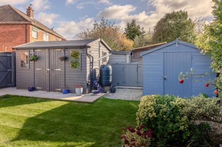 The private and enclosed rear garden is mostly laid to lawn, bordered by mature flower beds that add colour and character throughout the seasons. A timber-built storage shed with power provides practical storage solutions, and there is an outdoor power supply for added convenience.