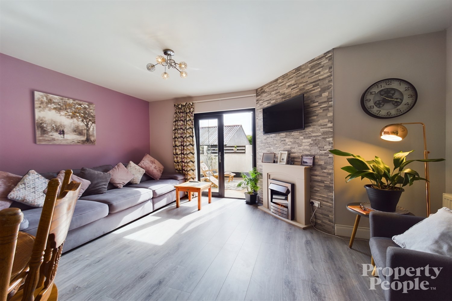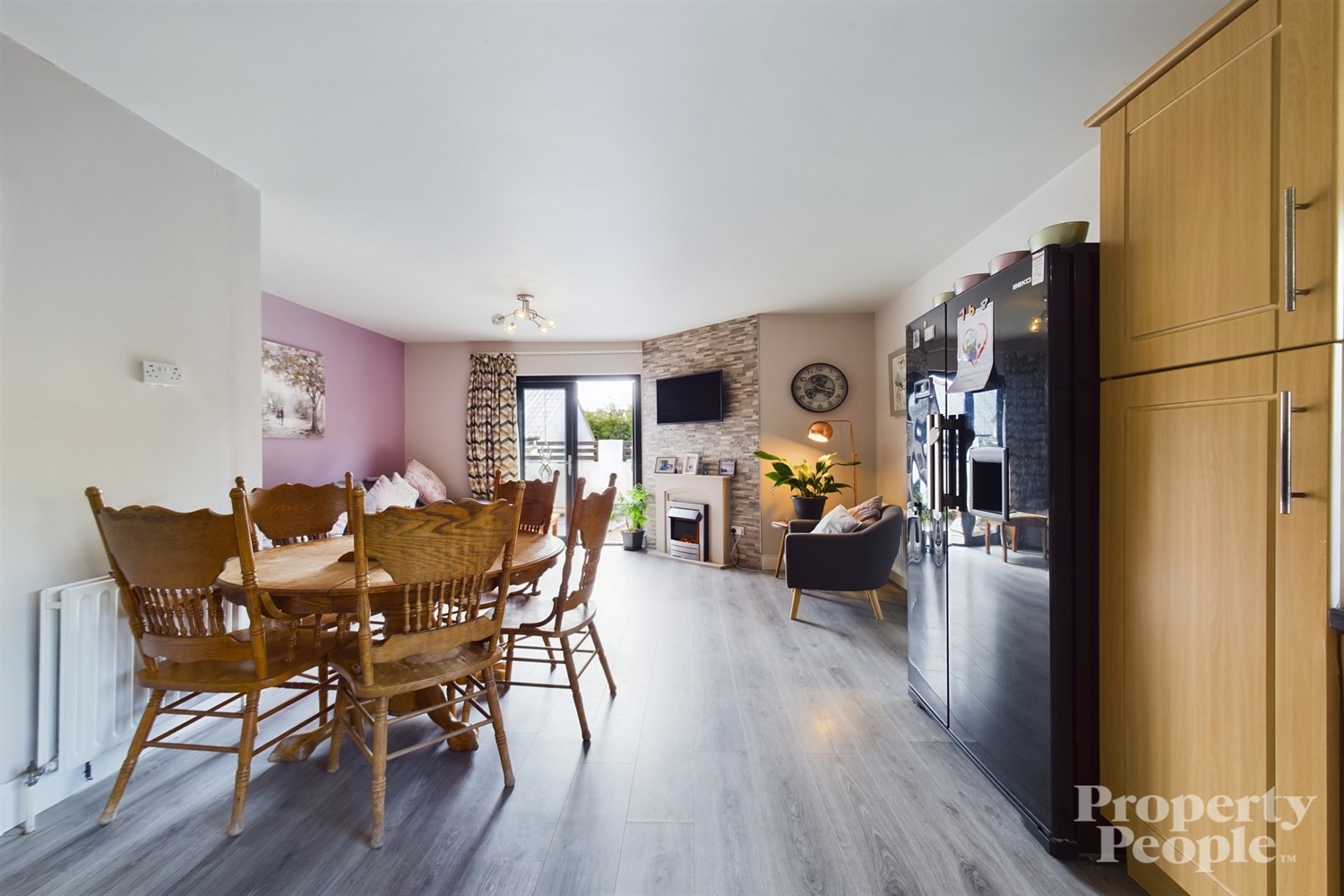 The next room just off the hall is the generous kitchen, dining, and living area. This room is the heart of the home where meals are prepared, homework done, and stories about each other's day exchanged. The kitchen features a large range, an extractor fan, black granite worktops, a double sink, and high and low-level kitchen units for storage. At the far end of the area is found a cozy sitting area with an electric fire and access to the side patio through double doors. Through the double doors, the side patio provides an outside living space made for entertaining, barbecuing, and (when weather permits) chilling with the warm sun on your face.